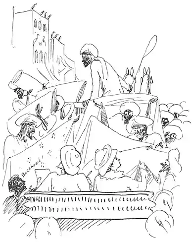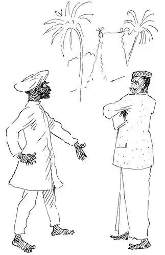 The drama of the official tug and the cargo boats was again performed, and there was much hoisting of coffee-bags, in and out, and a taking of fresh provisions on board. The Traders came aboard, too, with Fez caps, bead and shell necklaces, post-cards, and other trifles. It was amusing to see our French friends buying the Fez freely, and not only wearing them themselves but putting them on the heads of their children. There had already been some astonishing transformations in costume on board since the cooler weather set in, topis and white drill being exchanged for tweed suits and caps or felt hats, and, in some cases, smart official uniforms with shakos.