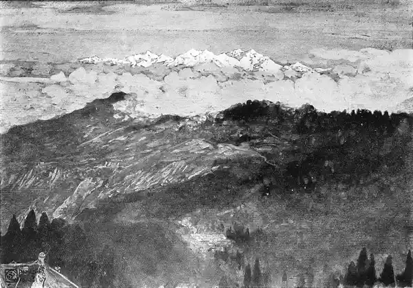We left Kandy the next morning for Nuwara-Eliya; our travelling companions were two Germans from Berlin, father and son. The train continued to climb, the line curving more sharply than before. We saw some fine mountain distances and Adam’s Peak rising up afar, and soon entered a vast tea-planted district, the tea plants often bordering the railway line, and covering the slopes of the hills which seemed covered with a more or less regular303 green pattern, the dark velvety green of the tea plants intersected by the light feathery foliage of young rubber-trees, planted in regular rows at intervals in some places. The landscape was very clear and every detail sharply defined in the bright sunlight, with very little suggestion of atmosphere, except for the mountain distances which were deep blue.