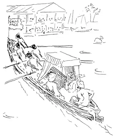 The steamer did not land its passengers at the quay, but anchored in the harbour, and everyone landed in boats. The Hotel boats, manned by291 native oarsmen, row swiftly to the Custom House, and often race each other. After passing the customs we got into a little Victoria and drove straight to the Galle Face.
