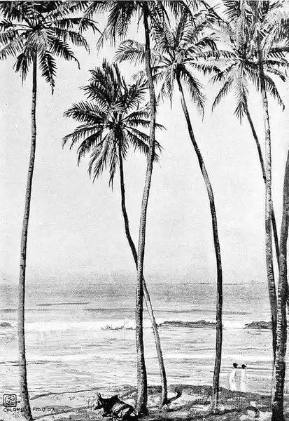 The Governor’s house, as usual, is the most attractive looking building, half hidden amidst masses of palms and other trees. A rather bold clock tower faces a long esplanade, which extends for nearly half a mile along the sea front, at the end of which is situated the Galle Face Hotel, with its cluster of slender-stemmed cocoa palms leaning over the sea. Here, the long ocean breakers rolling in, the turquoise waves melting into dazzling foam, seen through the palm trees has an enchanting effect, both in the sunlight and the moonlight. There was a young crescent at night—seen, as only seen in the East, on its back—floating like a fairy boat, and casting a mysterious light over the dark ocean, the waving palms overhead and the sound of the breaking waves adding to the wonderful charm of the scene.