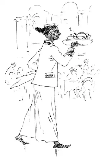 The hotel was served by an army of Cingalese waiters who wore their hair much like the southern Indians—long, like a woman’s, and done up in a293 knot at the back, their peculiar distinction, however, being a semicircular comb of tortoise-shell worn like a coronet on the top of the head, but with the open points in front. Otherwise their costume consisted of a close white skirt, and a neat white jacket with green facings. Their feet were always bare, like the Indian boys.