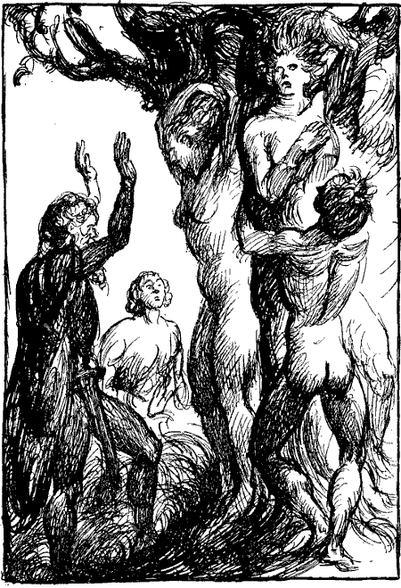 Und wie der Sturmwind fuhr Wodan hinaus und würgte zwischen den Händen, was er erfassen konnte von den tausenden von Truggespenstern, und hing die[9] erdrosselten an seinen Gürtel. Und nur wenige waren, die ihm in den Ritzen und Ranken entkamen.