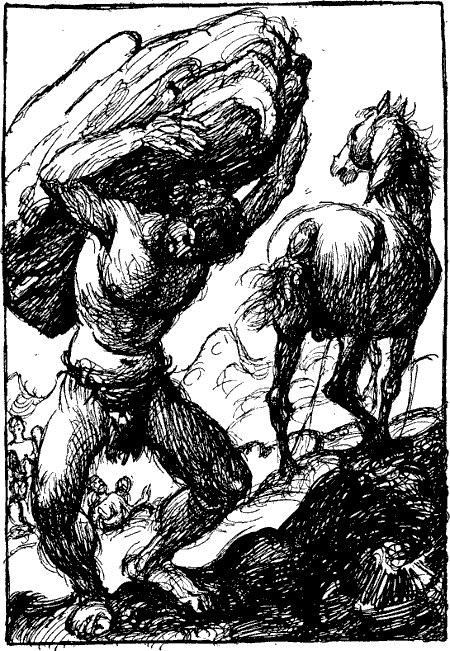 Da drehte sich der Riese wie ein Flegel auf den Bauch und wies die Kehrseite, daß die Männer und Weiber seiner Sippe vor Vergnügen brüllten und sich das Mißgunstvolk der Maren und Schrate, der Truden und Alben meckernd in der Luft überschlug.