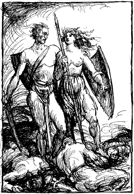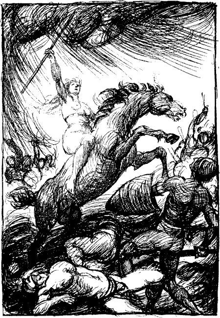 Schon sind die Massen im Kampf. Surturs Feuerreiter verbrennen Wiesen und Weiden. Aber die Einherier[206] fürchten nicht Flammen noch Rauch. Nicht umsonst ist Sigurd durch die wabernde Lohe zu Brynhild, der Walküre geritten, nicht umsonst kämpften die Helden alle in brennenden Hallen. Mit dem Blute der Erschlagenen dämpfen sie die Glut des Kampfplatzes und werfen die Brandreiter zurück.