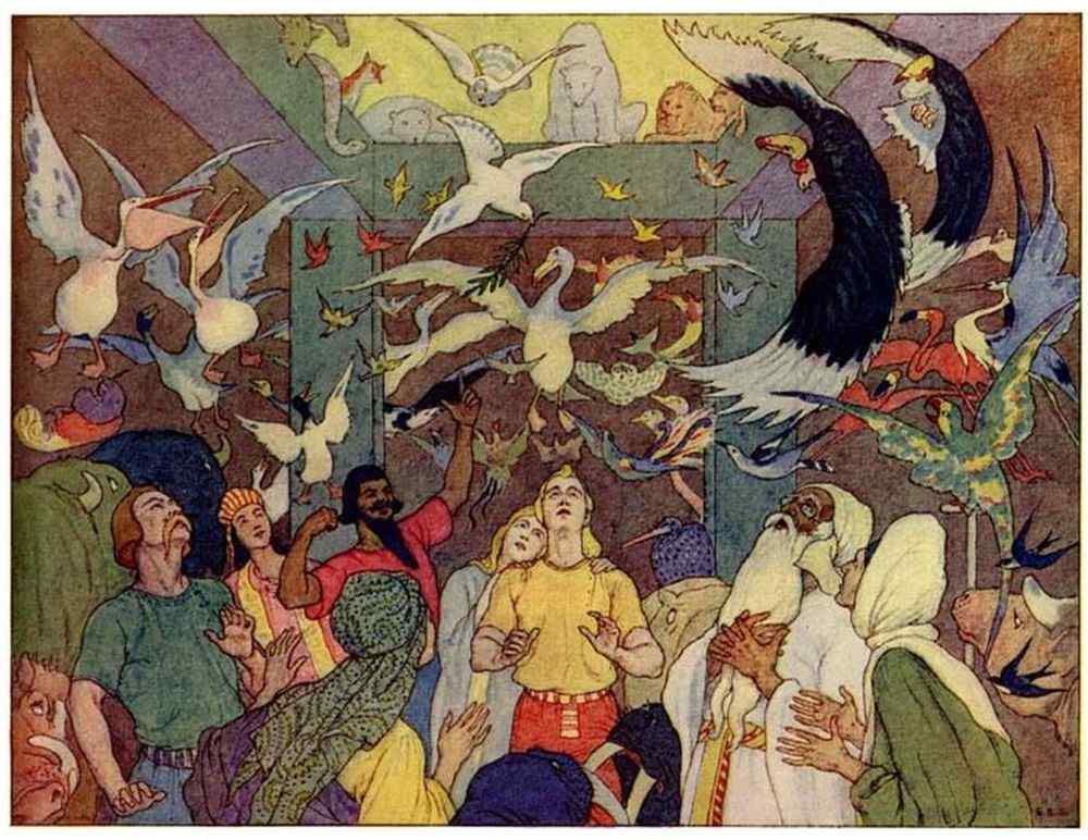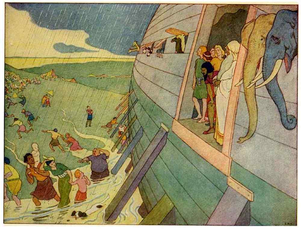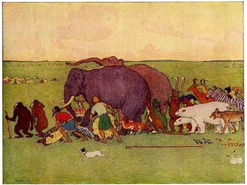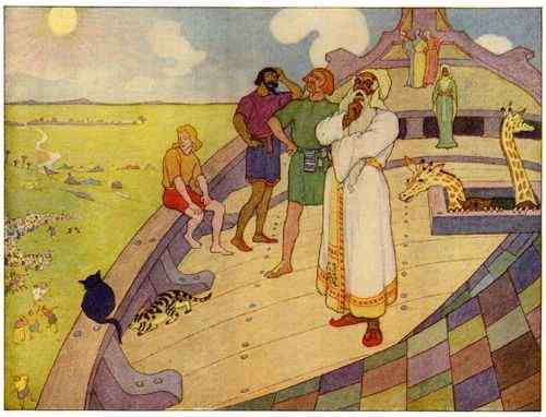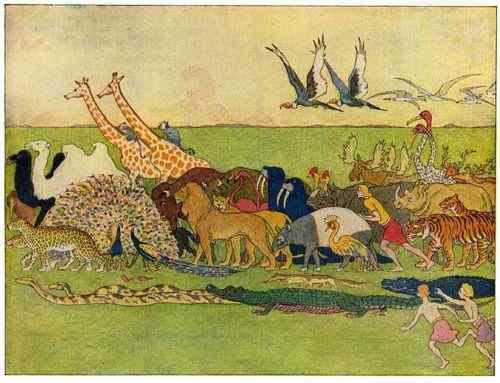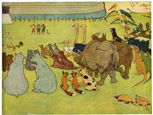 Then Noah went abroad and called together all the animals, by twos, and told them that they must come into the Ark to be saved from the deluge.