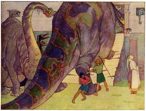 And then came even the huge dinosaurs, for in those days were mighty beasts. But they were too big for the door, and could not squeeze in.