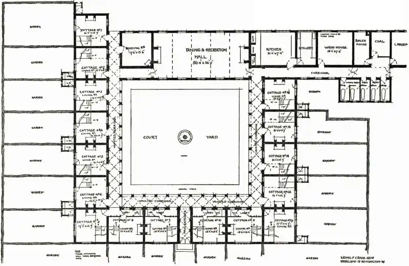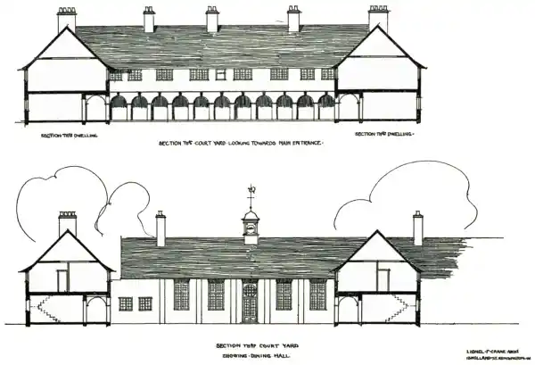 The sketch plan and elevation of a collective dwelling (at page 116), for which I am indebted to my architect-son, is offered as a suggestion of what could be done in this way on very simple lines. Each tenant in such a collective dwelling would have his private house or cottage, with the advantage of the use of the common dining-hall, and the service of a collective kitchen; also a general reading-room, and to these rooms a vaulted way with an open arcade on the side next the quadrangle would enable each tenant to reach this part of the building under cover from his own dwelling, which comprises a private garden, as well as the use of the common quadrangle.