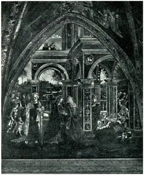 The portability of the easel picture may have something to do with its unrelatable character in270 some cases. Destined for nowhere in particular as a rule, it goes on tour—a member of a performing and often very diverse company, to all the provincial towns, and even on the continent. Yet there were portable and even folding pictures in classical and mediaeval times, and certainly there was no want of decorative relationship in the latter period when, as we know, they were often most beautiful pieces of furniture and wall decorations, as well as pictures. Even the gold-framed oil picture was frankly treated by the Venetians as a decoration—and a ceiling decoration—as witness the Tintorettos in the Ducal palace.