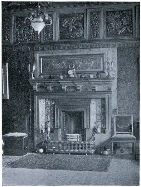 Frieze and Panel over Fireplace and subsidiary work on the Woodwork of the Fireplace, Designed by Walter Crane. The Fireplace Designed by Philip Webb From a Photograph by W. E. Gray