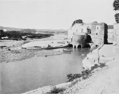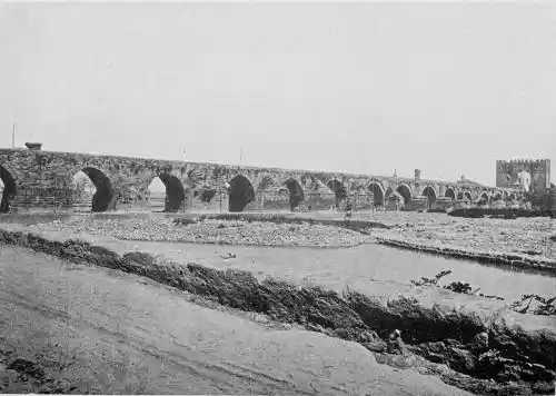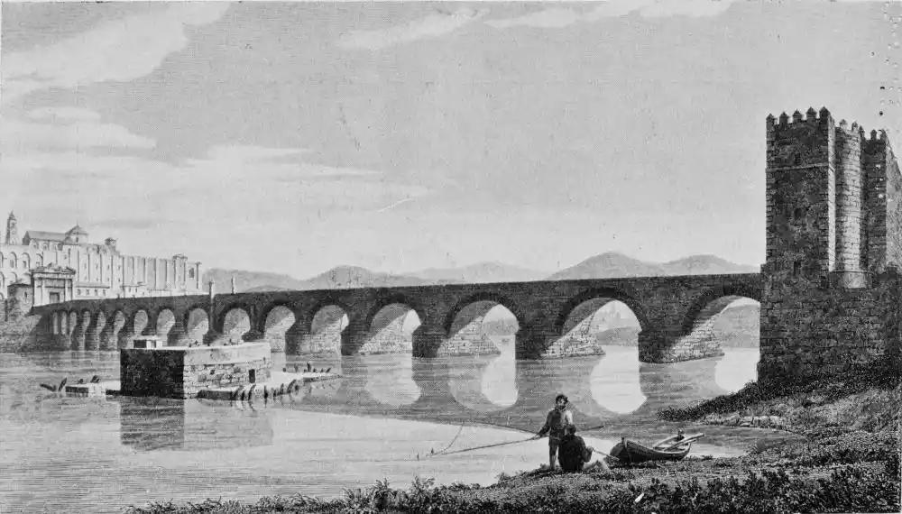 Standing on the massive bridge which spans the Guadalquivir, one looks upon the mosque, the city walls, and towers of churches. The Campo de la Verdad forms a broad promontory washed by the river, and we see quaint Morisco water-mills, and the lever nets of fishermen. There are seventeen arches to the bridge, which is of Moorish design, standing upon piles constructed by the Romans. In the distance rises the range of the Sierra Morena, a savage wilderness of rock, ravine, and crag, haunted by the boar, deer, and lynx. Winding through rich meadowland, the Guadalquivir flows, now in swift shallows, and then in slow deeps, which from certain points of view resemble landlocked pools. The river is wide, but not of great depth. Its flood is stained brown from the soil through which it flows, and at times, when the mountains pay their tribute of swollen streams, the Guadalquivir speeds in a turbid current, filling its banks to the brim.