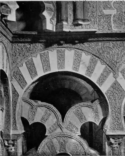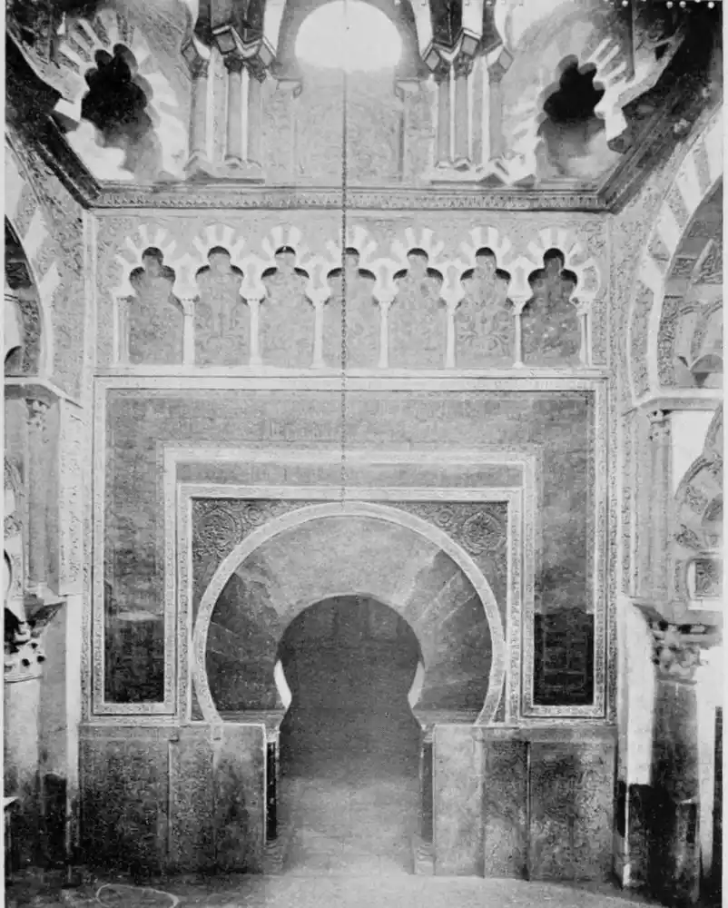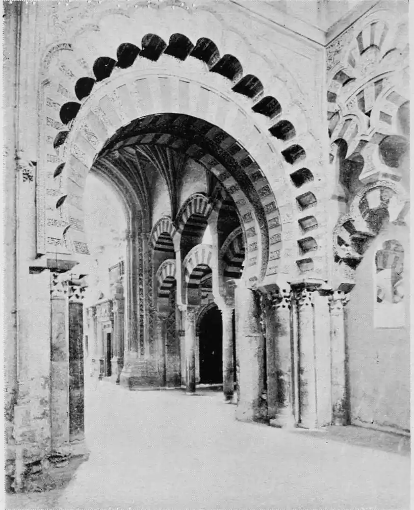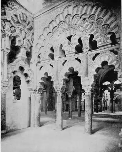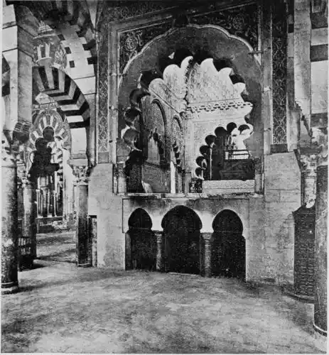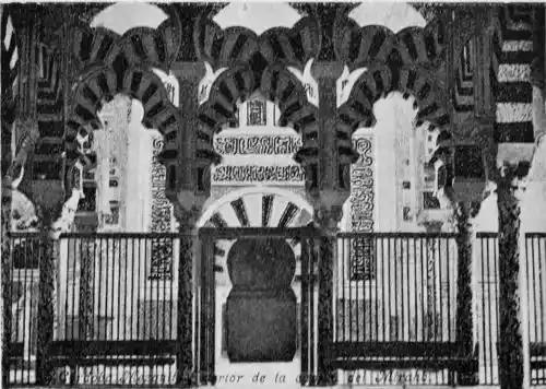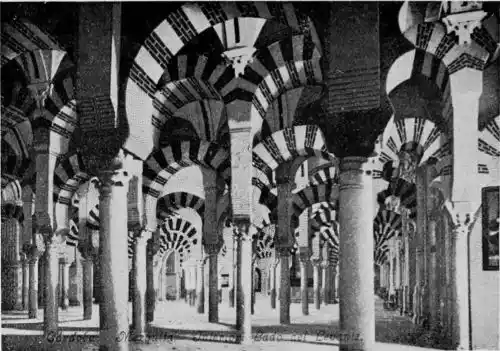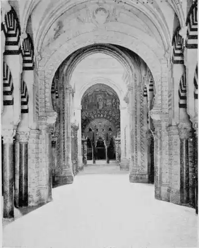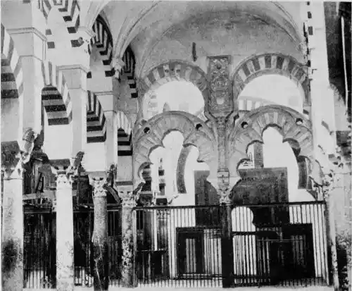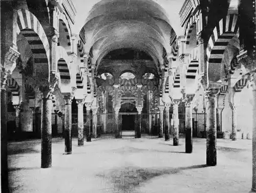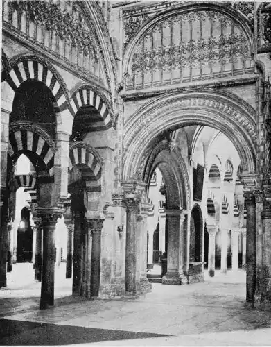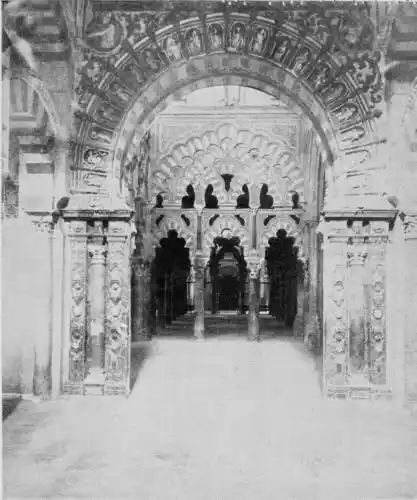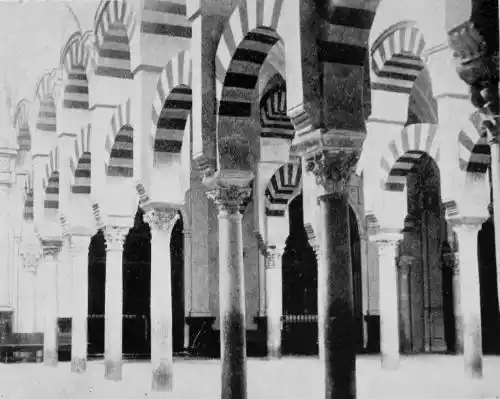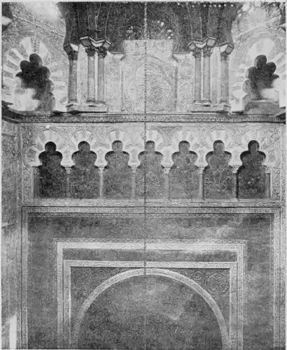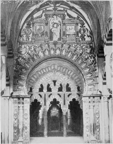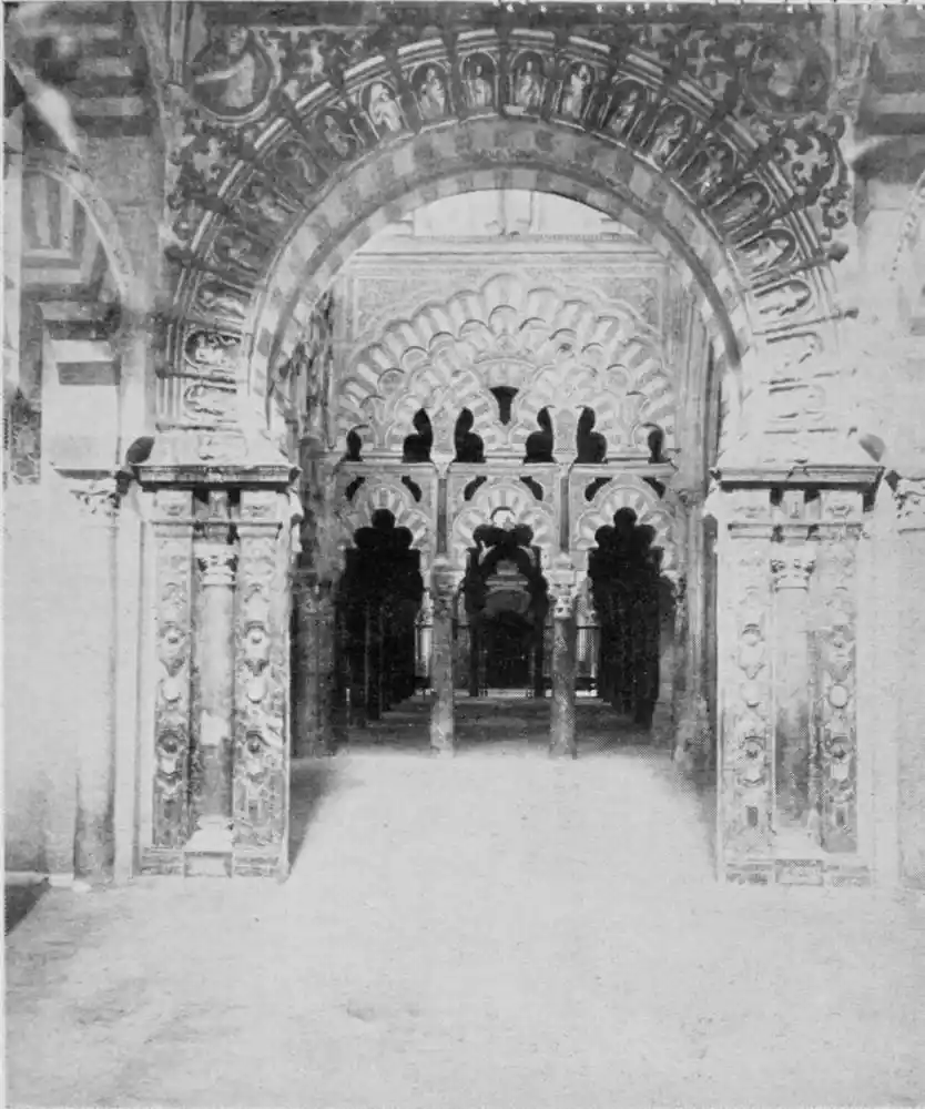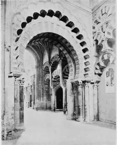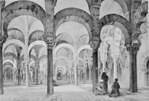 Tangible evidence of a superb civilisation surrounds us in Cordova. We see examples of early Moorish architecture brought to its highest artistic manifestation in the mosque. We listen in vain for the voices of teachers, the song of the singers and poets, and the call of the muezzin to devotion; but we tread in the footsteps of the long-vanished Moor, and read his story in the noble lines, chaste embellishments, and gorgeous details which his skilful hands produced.{13}