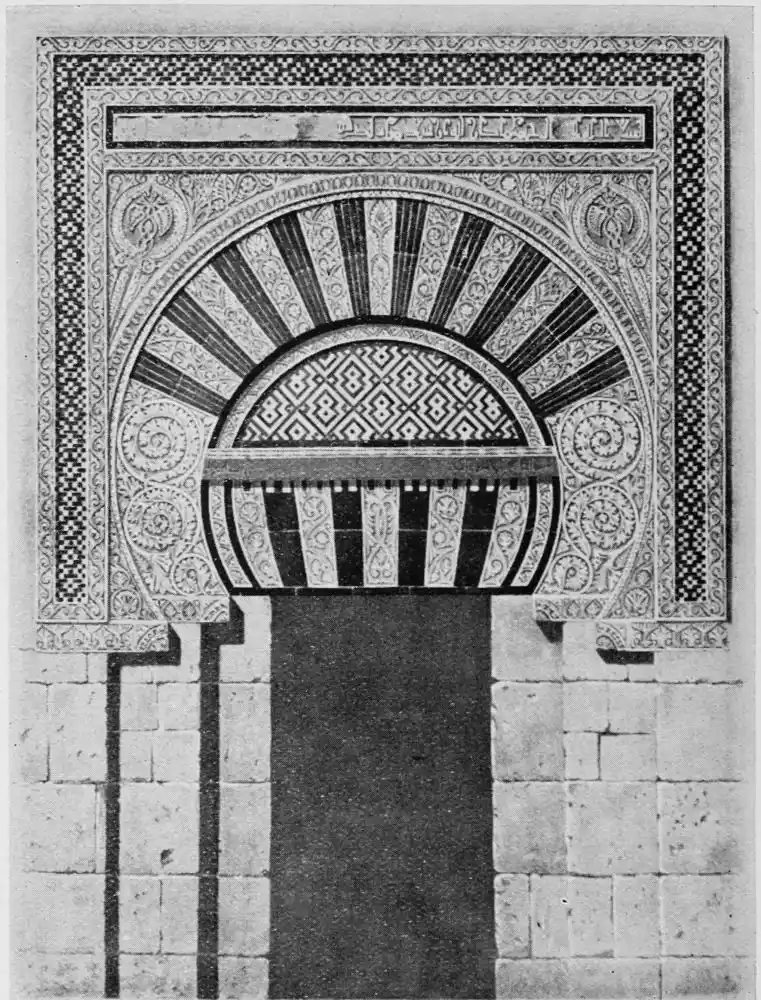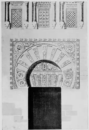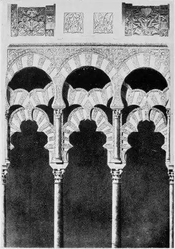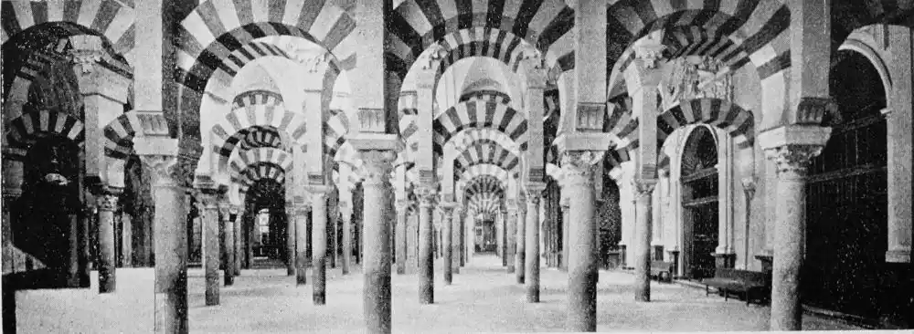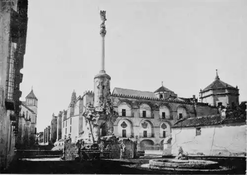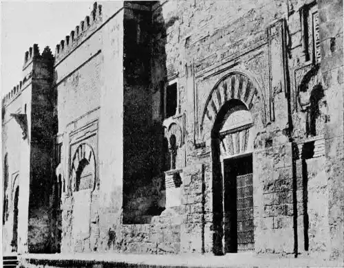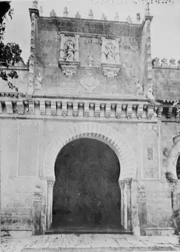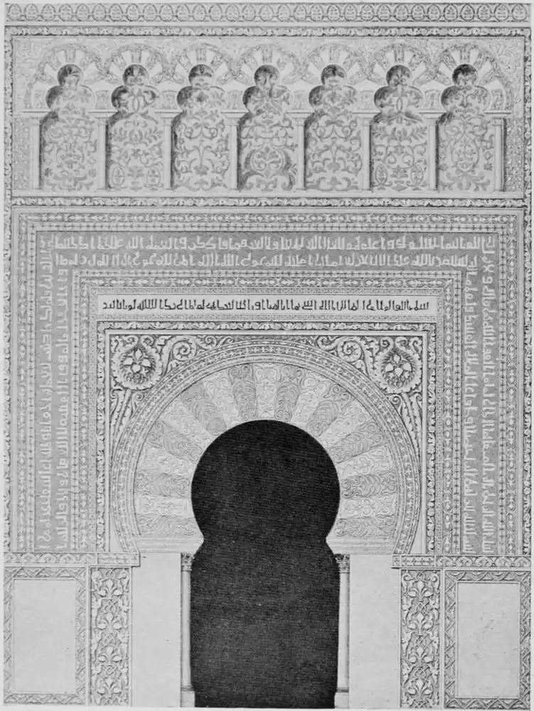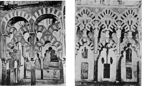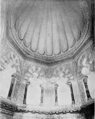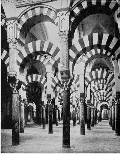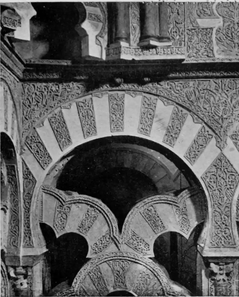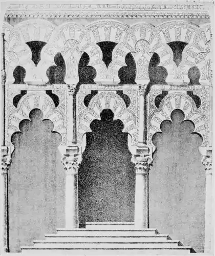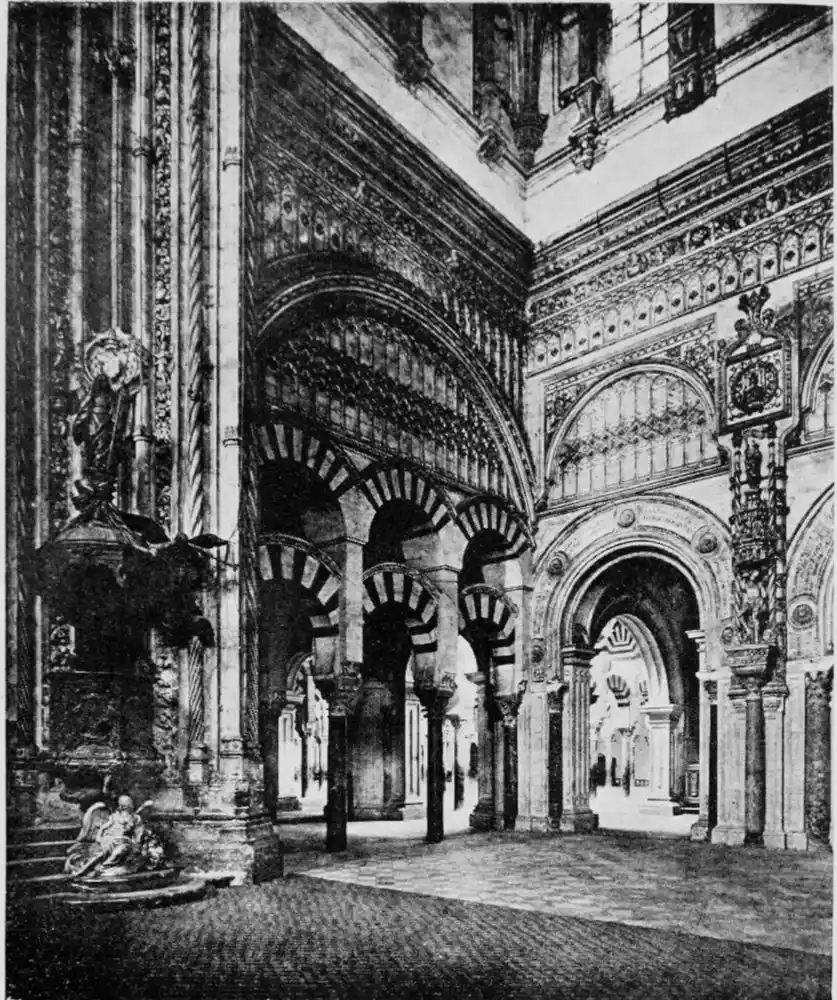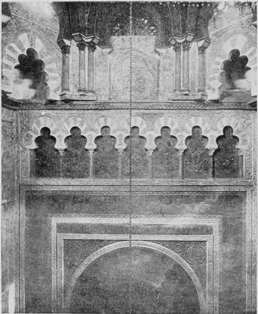 Tangible evidence of a superb civilisation surrounds us in Cordova. We see examples of early Moorish architecture brought to its highest artistic manifestation in the mosque. We listen in vain for the voices of teachers, the song of the singers and poets, and the call of the muezzin to devotion; but we tread in the footsteps of the long-vanished Moor, and read his story in the noble lines, chaste embellishments, and gorgeous details which his skilful hands produced.{13}
