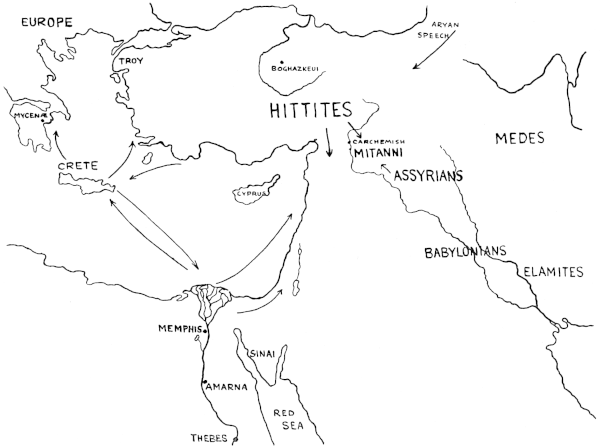 At the time of Tutankhamen the great peoples that had built up civilization were losing their dominant position. Egypt’s power was showing definite signs of weakness, which were intensified rather than caused solely by the pacifist policy of Akhenaton and his sons-in-law. For even the vigorous rule of the powerful pharaohs of the nineteenth dynasty merely revived Egyptian power for a time before its final collapse. Fifty years before Tutankhamen, the Palace of Knossos had been destroyed in Crete, marking the downfall of the great pioneer of Mediterranean civilization20 to which Greece and Europe as a whole became heir. Babylonia also had reached the limits of her influence: and the weakening of these three earliest great powers allowed the Hittites and the Assyrians to struggle the one with the other for supremacy, crushing out such states as that of the Mitanni, and by exhausting themselves, so prepared the way for the eventual incursion of Persia into the Mediterranean area.