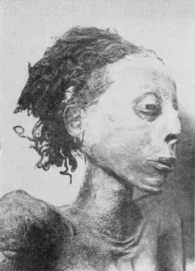 That they profited by this experience is evident from the changes they effected in their technique after they had realized wherein the 60 methods employed during the twentieth dynasty failed to attain the desired aim. For their innovations were directed towards remedying the most obtrusive distortions found in the mummies of the nineteenth and twentieth dynasties. The sunken cheeks were filled out by means of packing them with linen or mud, artificial eyes were inserted, the nose, lips, and ears were protected from distortion by wax plates, and the cheeks were painted. Many other devices were introduced to convert the mummy from a shrunken caricature into a more life-like portrait.