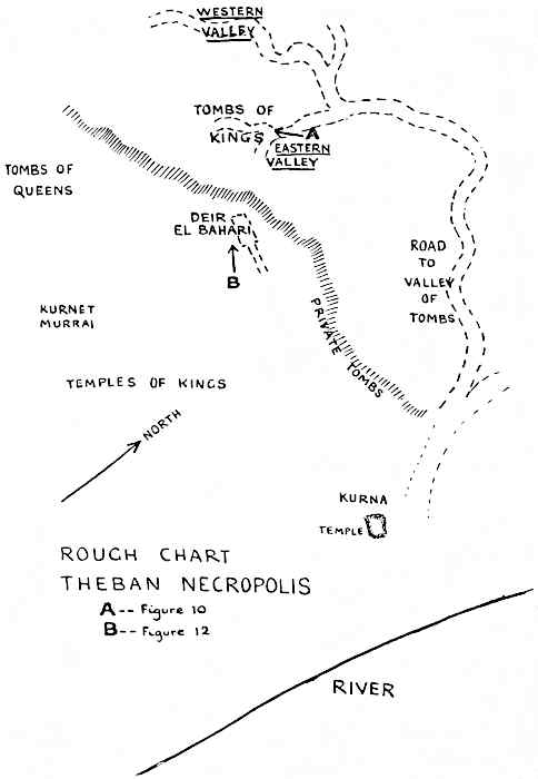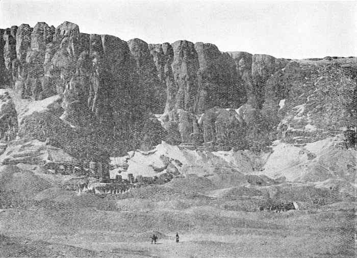 The work of modern exploration of the Valley of the Tombs of the Kings can be said to have begun in 1819 when the traveller Belzoni opened and wrote a description of the tomb of Seti I. In 1881 the discovery was made of a collection of royal mummies, many of which had been buried about thirty centuries ago in the Valley of the Tombs, and had been removed about 1000 b.c. and hidden in a chamber in the great cliff (behind Deir el Bahari) that faces the Nile across the Theban plain. This stimulated renewed interest in the famous necropolis, but it was not until 1898 that the work of exploration there was rewarded by the discovery of the tomb of Amenhotep II containing the mummy of that pharaoh himself—the only king’s mummy ever found in his own tomb before the discovery of Tutankhamen’s, in which it is confidently 25 believed the mummy is present and undisturbed, an unprecedented circumstance which will make the investigations next winter peculiarly important. For the mummy of Amenhotep II had been badly plundered like all those discovered before or since until the opening of Tutankhamen’s burial chamber made it practically certain that in it will be revealed for the first time to modern men the undisturbed tomb of an ancient Egyptian king.
