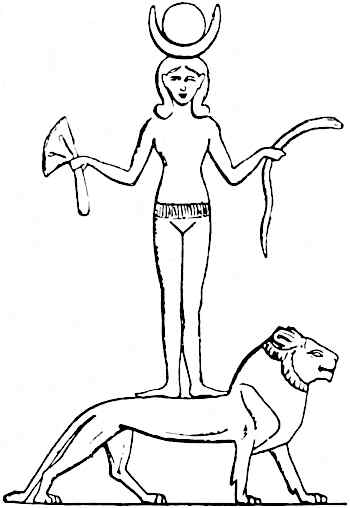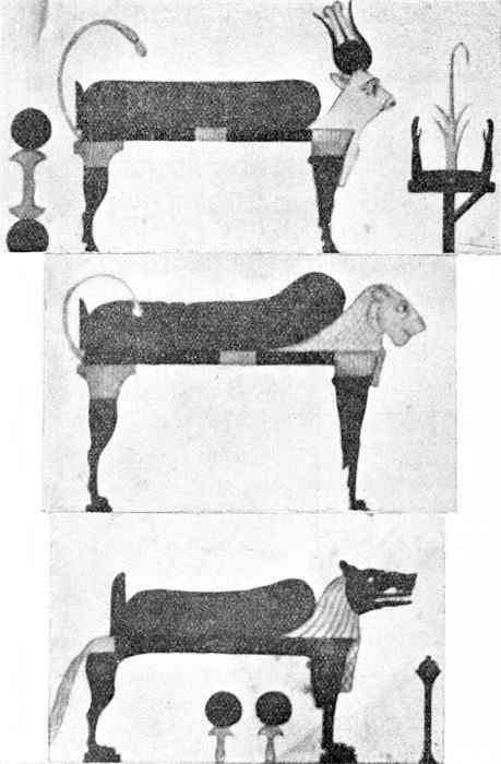 The explanation of the lioness form of the Great Mother is also given in the inscription in Seti I’s tomb. When the goddess was called upon to rejuvenate the ageing king, the 113 only elixir of life known in her pharmacopœia was human blood. Hence, she was driven to the necessity of slaying a human being, and her murderous action was compared to that of a man-slaying lioness, with which she was identified. But as the lioness was a particularly appropriate form to symbolize the Great Mother’s ability to protect the mummy from the perils that lurked in the pathway to the other world, it became an even more favourite form of the funerary vehicle than the gentle cow. At any rate, in the pictures of funerary couches the lioness form is much commoner than the cow-form. The same grotesque form of the lion has survived in modern heraldry.