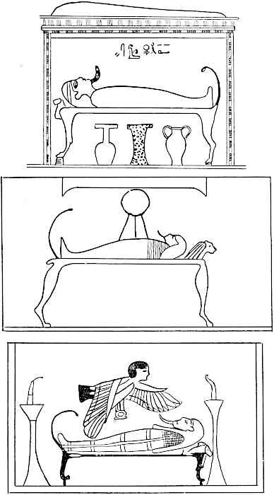 The same design occurs in the pictures illustrating the Book of the Dead. The funerary couch is usually represented in the lion-form, the cow- and hippopotamus-varieties being much less frequently adopted.