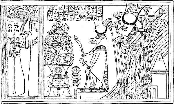 To understand why the cow, of all creatures, should have been selected for this purpose, we must remember the relentless logic and persistency that inspired all the preparations of the tomb and its furniture. The mummification of the body and the elaborate arrangements for protecting it and ministering to its wants were due to the belief that the continuance of the deceased’s existence had been secured by these preparations. But to make doubly certain, no device that would contribute to the attainment of this aim was neglected. Inscriptions were made on the walls of the tomb, on the sarcophagus and coffins, and on papyri to ensure the identification of the deceased king with Osiris, so that he might be made to share the god’s fate. A figure of Osiris was made, as I have explained elsewhere (p. 61), out of the sacred barley, every grain of which was regarded as a model of the life-giving Great Mother, and as such a supply of vital essence to maintain the deceased’s existence. From time to time dramatic ceremonies were held at the tomb (or in the temple associated with it in far-off Thebes) to reanimate the dead and help him to persist.