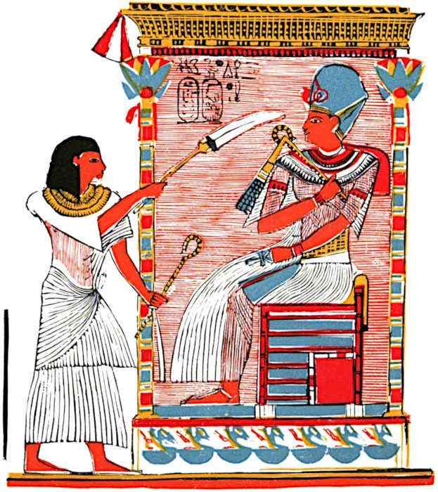 The little information we possess of his reign is derived mainly from the inscriptions upon the Theban temples restored by him after his return to the orthodox faith, though many of these records are palimpsests, for Horemheb replaced Tutankhamen’s name on most of them. The two other chief sources of information are: (a) the piece of linen found in 1907, which is the only certain evidence that he reigned as long as six years; and (b) a remarkably interesting series of wall-pictures in the tombs of Huy at Kurnet (Murrai), which afford the only record we have of Tutankhamen’s relations with Ethiopia and Asia. These pictures are among the most familiar records of ancient Egyptian life, having been used by Champollion, Lepsius, Brugsch and Piehl, and the inscriptions describing the scenes have been translated into English by Professor Breasted.[1]