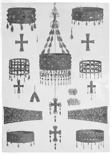 There are few sculptures left which can with any certainty be referred to the Visigothic period. The fragments discovered at San Romano de Hornija, at Toledo, and at Seville, though they bear vestiges of Visigothic workmanship, belong in reality to the Christian period. It would seem that the Visigoths for the most part limited their work to restoring the Roman buildings and adapting them for Christian uses. The ornamentation which they often added is usually of Byzantine origin, an influence reaching Spain through France. Yet the sumptuous character of their art is shown in the only important works of this period which remain: the splendid votive crowns of Kings Recceswinth and Swenthila, found in 1858 at Guarraza, near Toledo (Plate 1), and now in the Royal Armoury, Madrid, and in the Musée de Cluny in Paris. But these crowns are not Spanish works. Indeed many centuries separate the genuinely Spanish carvings of the Iberian artists from any work that again manifests the characters which belong to the native art.