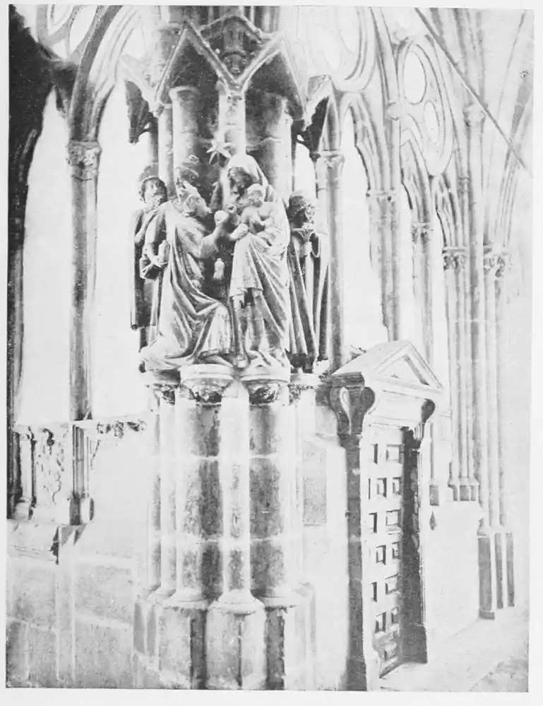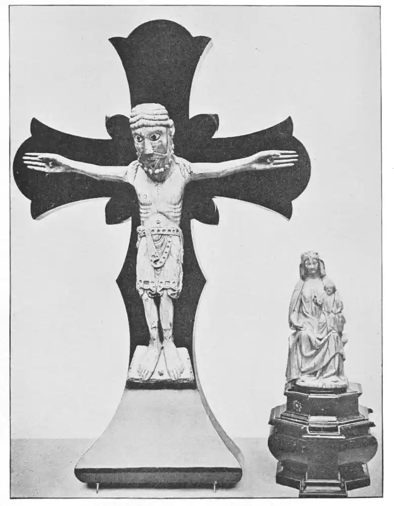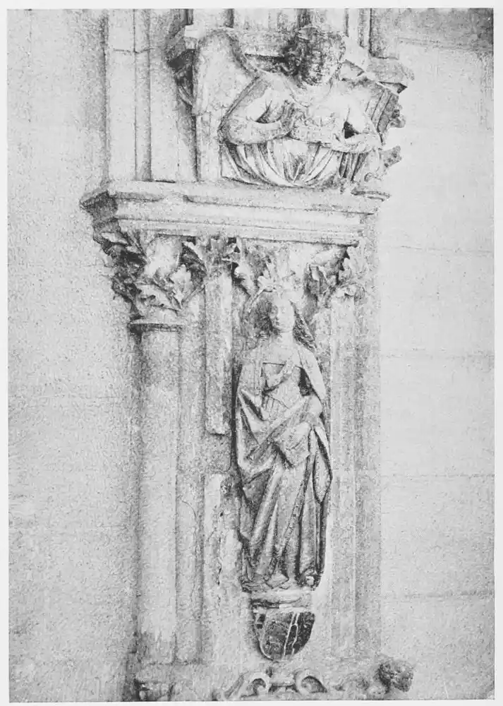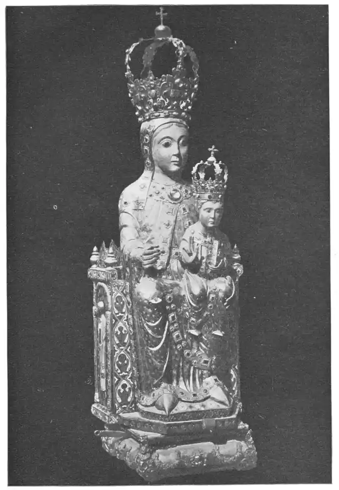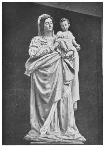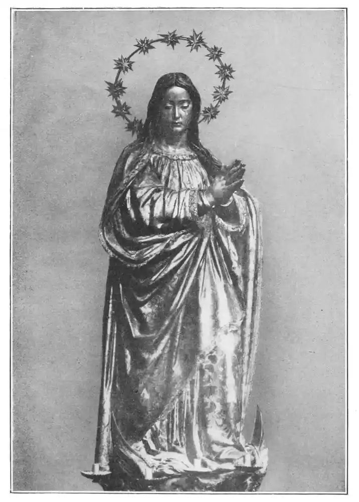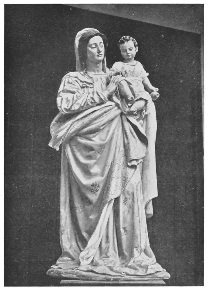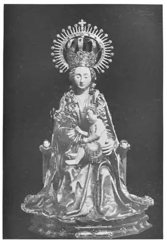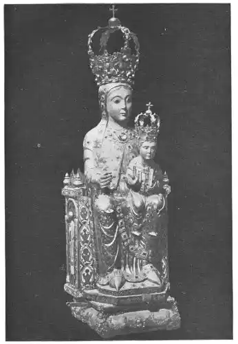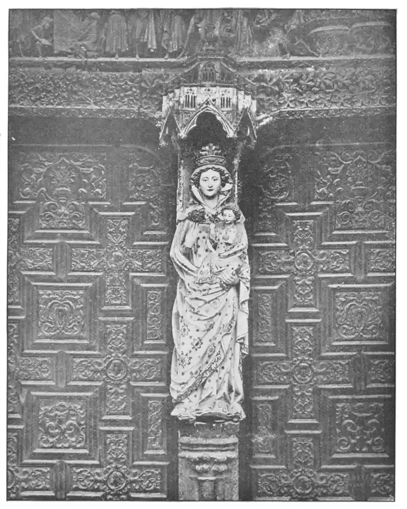 Before closing this chapter it is left to notice a few isolated works that are treasured in the different cities of the Peninsula. And first must come the perfect statues and statuettes of the Virgin, which, as we might expect in religious Spain, are to be found in almost all the great churches. That known as the Virgin of Huarte, which was carved by Juan de la Huarte, was brought to Pampeluna in 1349. The statue is of white marble, and the face and vestments still bear traces of colour. Of a noble simplicity, it is one of the most exquisite produc{48}tions of art in the fourteenth century. Of less ideal beauty, but more Spanish in its sentiment, being without the French influence, is St. Ferdinand’s small ivory statuette of the Virgen de las Batallas in the Capilla Real of Seville Cathedral. This is one of the earliest works of the kind in Spain. The Cathedral of Plasencia has several images of the Virgin. Good examples—one in silver and richly jewelled—are found at Burgos and Salamanca (Plates 51 and 52), besides figures carved in wood and coloured, and also at Toledo, Sigüenza, Gandía, Segunto, and the churches in many other cities. The Santo Cristo of Burgos Cathedral may also be mentioned. Madonnas are to be seen over the altars of chapels, in gateways, or in the great retablos, as for instance at Leon (Plate 53), or again at Tortosa and Palma, where, in the last church, a really beautiful statue is hidden by a modern altar. Among these Madonnas are works full of dignity and sweetness, of genuine beauty, and carved without stiffness or looseness. They give a convincing defiance to those who decry ancient polychrome.