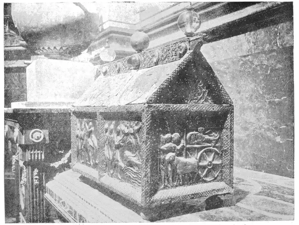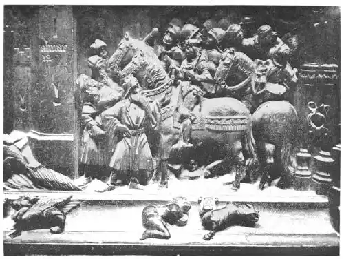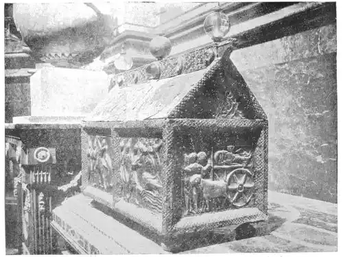 Besides the altar font the old monastery of Silos possessed a rich collection of religious furniture. Among those which have been saved are a chalice, used under the Mozarabic ritual for celebrating the communion, a very beautiful specimen of the mudéjar goldsmith’s work; an altar-screen of engraved copper with figures of the Apostles; and several small cofferets or caskets. One of these, composed of an elephant’s tusk, belonged to Rahman III., Khalif of Cordova, at the beginning of the tenth century; another, made at Cuenca in 1026, is of ivory, and represents a Mussulman: it was mounted in enamel at a later date (about 1150).