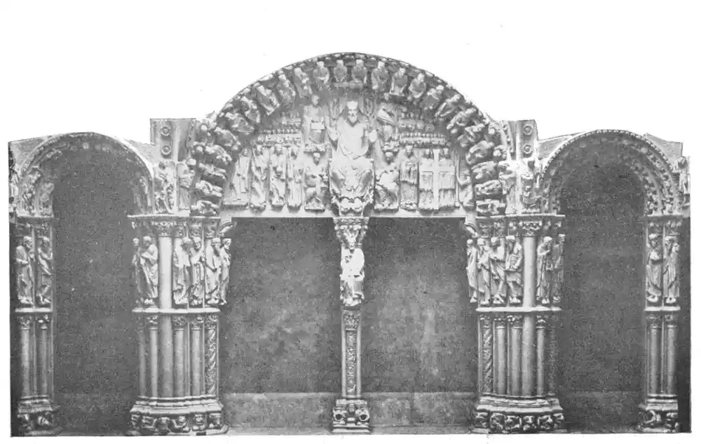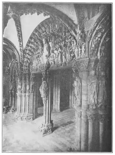 The most important of the early Romanesque churches is Santiago de Compostella (Plate 7), which was commenced and finished building during the twelfth century. It is a somewhat simplified copy of St. Sernin at Toulouse, and shows in its structure, as well as in its ornaments and{27} sculptures, very clearly marked, the influences of Cluny. This explains the great excellence of the carvings (Plates 8 and 9); works that are surprising at this period when so many figures are still barbaric. The admirable Puerta de las Gloria, which was completed by the carver Maestre Mateo in 1188, after twenty years’ work, is held by Mr. Street to be “one of the greatest glories of Christian art.” It is a vestibule or porch, divided into three sections, which extend across the entire width of the nave. The quadri-partite vaulting of the roof is adorned with elaborate carvings. Still more sumptuous are the carvings of the doorways; one, the double doorway which opens on the nave, has exquisitely delicate carvings. On the shaft dividing the doorway into two is a seated figure of St. James, holding the burdon or pilgrim’s staff; while the shaft itself has carvings of the Tree of Jesse. The shafts in the jambs have figures of the Apostles and Major-Prophets. The main capital above represents the Temptation in the Garden and Angels ministering to Christ. At the back of the middle pillar is a kneeling figure, supposed to be the portrait of Maestre Mateo. Then in the tympanum is a seated figure of Our Lord, with upraised hands; and round Him are the Evangelists and eight angels{28} with the symbols of the Passion, while above are a company of the worshipping elect. The archivolt shows figures of the twenty-four elders of the Apocalypse. The general idea of the subject of the whole doorway is the Appearance of Christ at the Last Judgment, but each of the series of small pictures is in itself an independent work of art. The side doorways which lead into the aisles are equally ornate. The shafts are adorned with figures of the Apostles; above are representations of Purgatory and Hell. All the figures are clearly painted. M. Marcel Dieulafoy does not think, however, that the tones which now show are the original colours, but that during the restoration in the seventeenth century some innovations occurred.