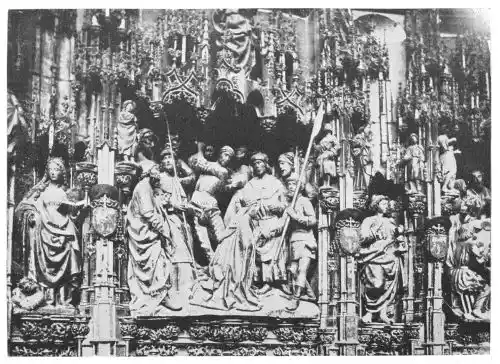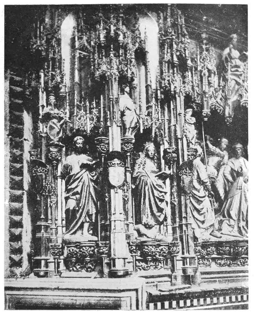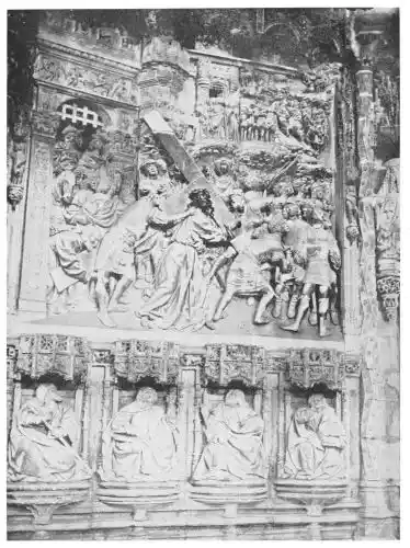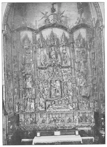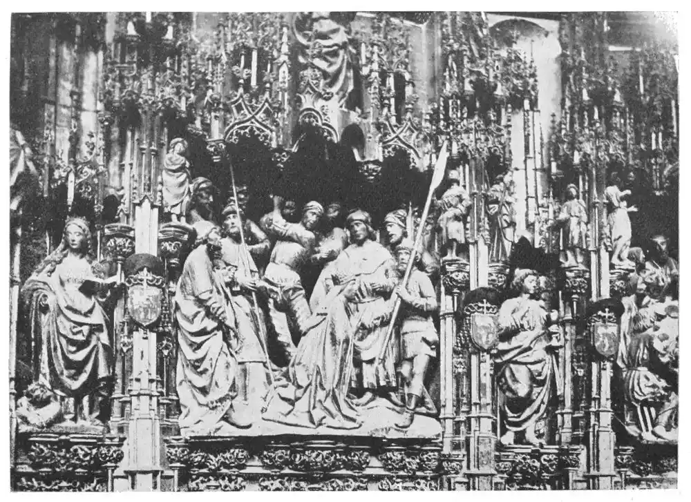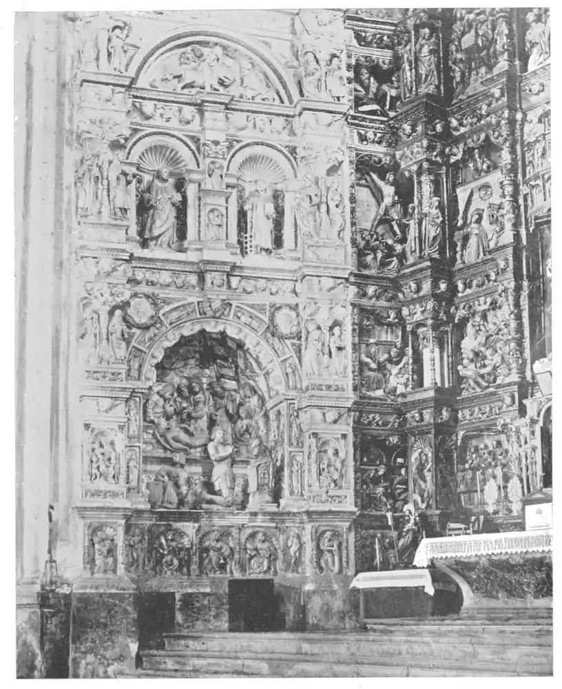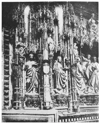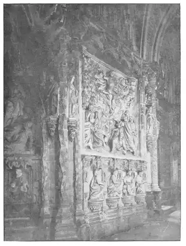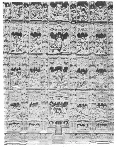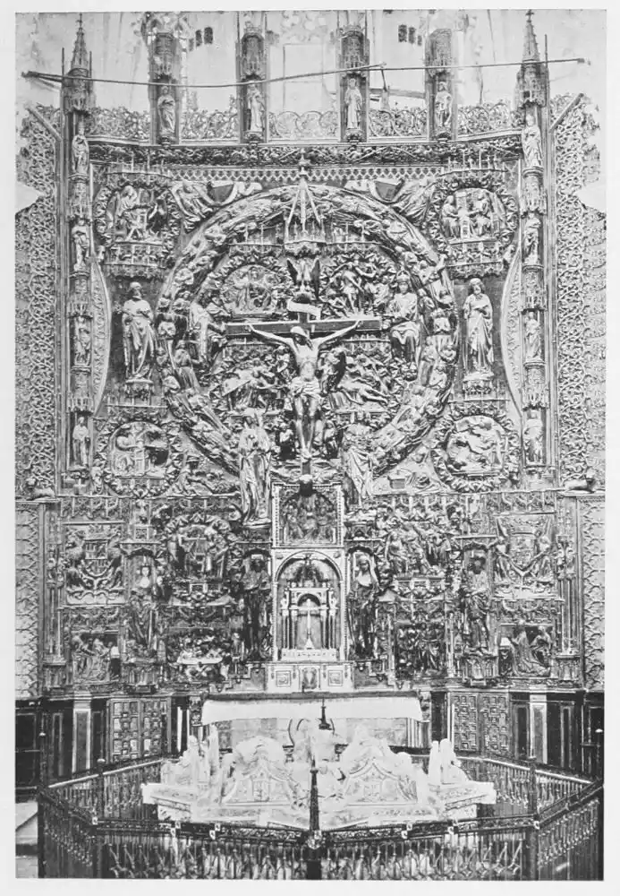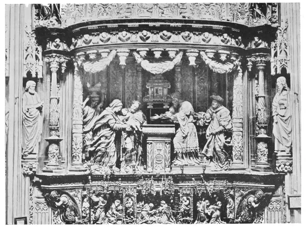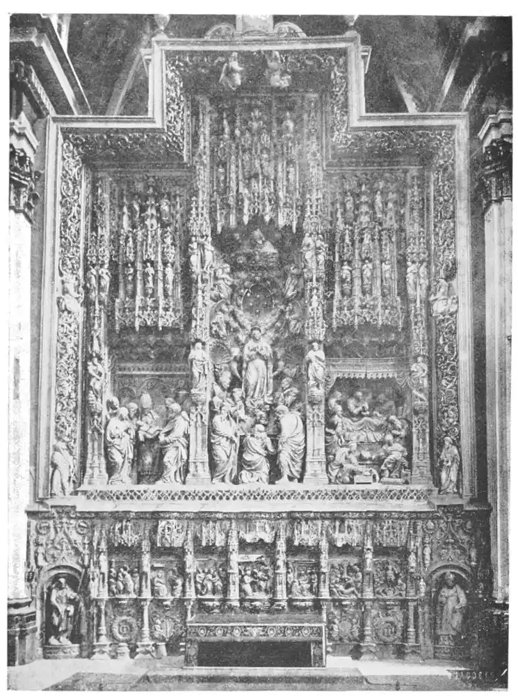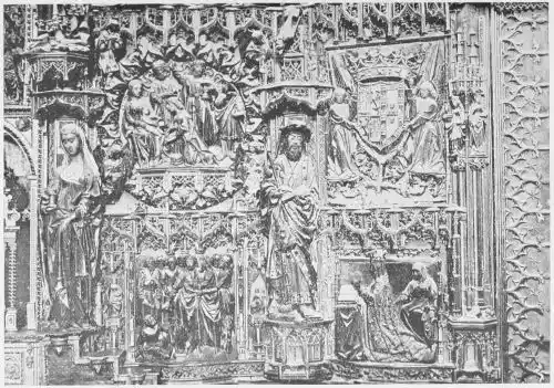 Four years later Dancart was entrusted with the important work of erecting the grand altar of the cathedral (Plate 134). He executed the design, but the work was carried out by his pupils Marco and Bernardo de Ortega. The latter artist worked at the screen until his death in 1505, when the completion of the work was left to his son Francesco and to his grandson Bernardino. Gomez Oroco, George and Alexis Fernando Aleman, and Andres de Covarrubias also worked at different parts of the screen. In 1519, when the work was completed, the canons, for some reason not known, employed a pupil of Fernando Aleman named Moya to modify the design. He{120} was three years over the work, which he finished in the autumn of 1564. Some years later two wings were added, and the screen was finally completed in 1564. This mixed authorship was a mistake, and has resulted in a want of continuity in the design which has marred to some extent the beauty and harmony of the work.