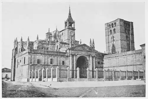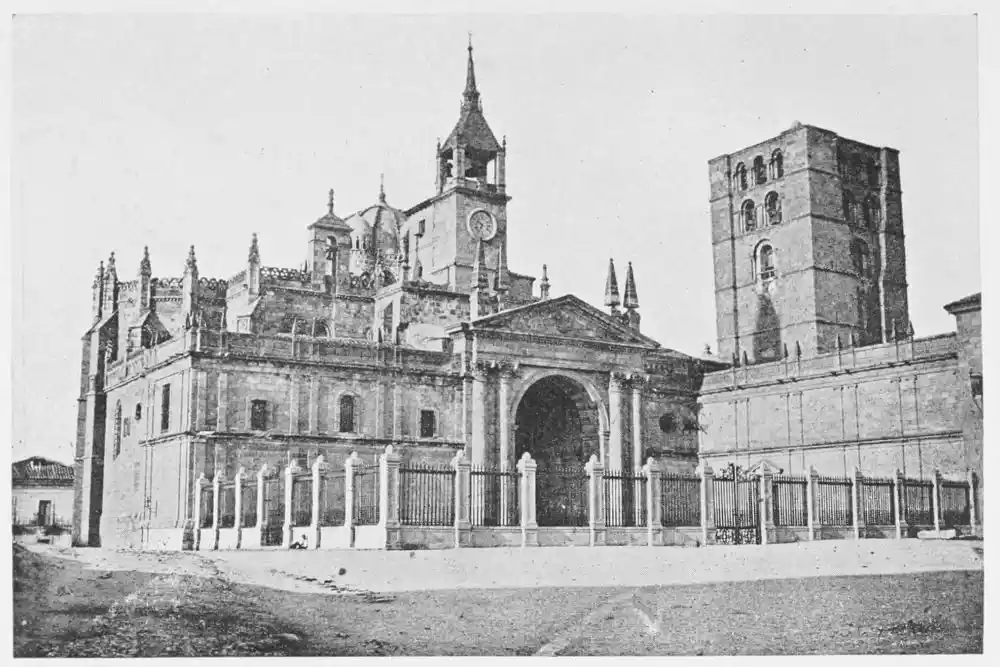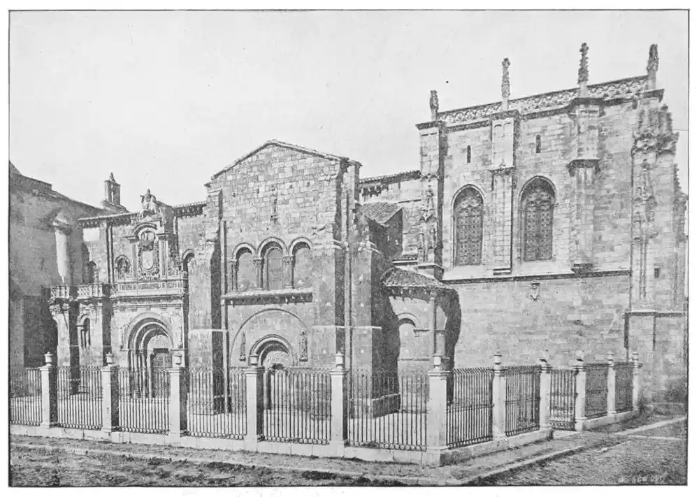 The Cathedral of Zamora (Plate 15) is a more important edifice. This ancient city had in succession two French archbishops—Bernard and Jerome de Perigneaux. It is probable that the church was erected during the episcopate of Jerome, who died in 1126. It was consecrated in 1174, as is now known from that date discovered in an old epitaph during the restoration in the eighteenth century. This makes impossible the old belief that the church was built by Bernard de Perigneaux. M. Marcel Dieulafoy believes that it is the work of an Aquitaine architect. Both the exterior of the building, with its square tower, graceful cupolas, richly decorated, and the interior are interesting, with a character very rare in Spain. Of the carvings of this church M. Marcel Dieulafoy writes:{32} “From the sculptural point of view I would signalise in the portal, the corinthian columns and niches, which both seem to come down from a monument of the decadence of the Roman age. One will notably remark the busts, bezel set in a sort of window, which has been seen in the monuments of Roman Gaul, on the northern slope of the Pyrenees, and which became a most common feature in the architecture of the Spanish renaissance; also the laurelled flying-arch, and the bas-relief of the spandril which crowns the busts.”