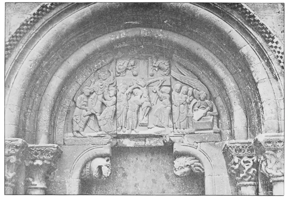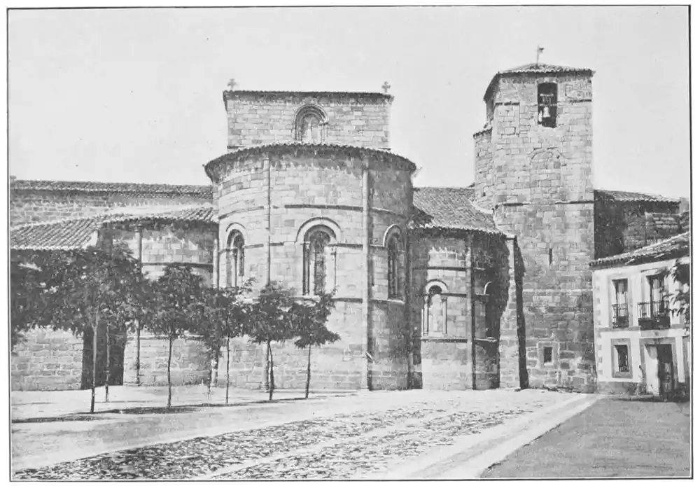 San Vicente of Avila (Plate 13) is another admirable example of the Romanesque churches. The nave, with its triforium and clerestory, is in a pure Romanesque style; while the transept, choir, and three semicircular apses are in the Transition style. Though the building was begun in the twelfth century it was not finished until three hundred years later, and for this reason it shows a more advanced art. M. Marcel Dieulafoy holds it to be “the most beautiful specimen and the purest example of Burgundian architecture in Spain.” The west portal (Plate 14) is decorated with admirable statuettes in terra-cotta, unfortunately much mutilated, whose style recalls that of St. Landre of Avallon. Very curious are the heads of bulls, decorating the base of the pilaster by which the tympanum is sustained. Here the analogy with the bicephalous capitals of the Achemenide is very marked.