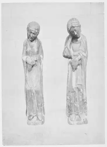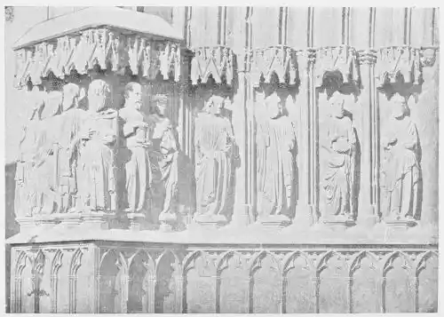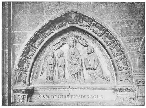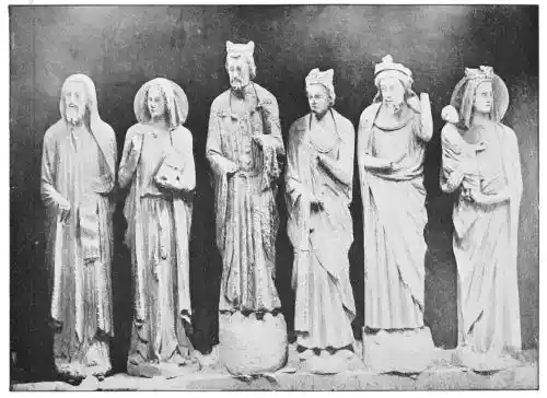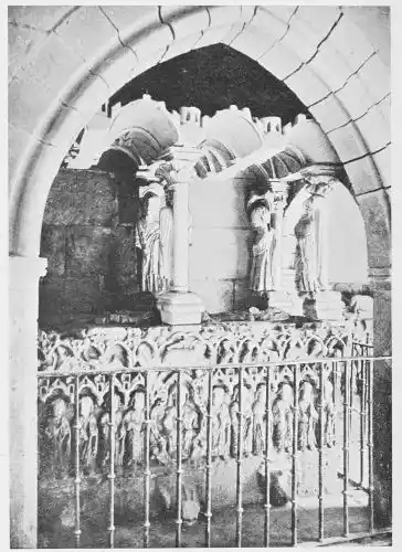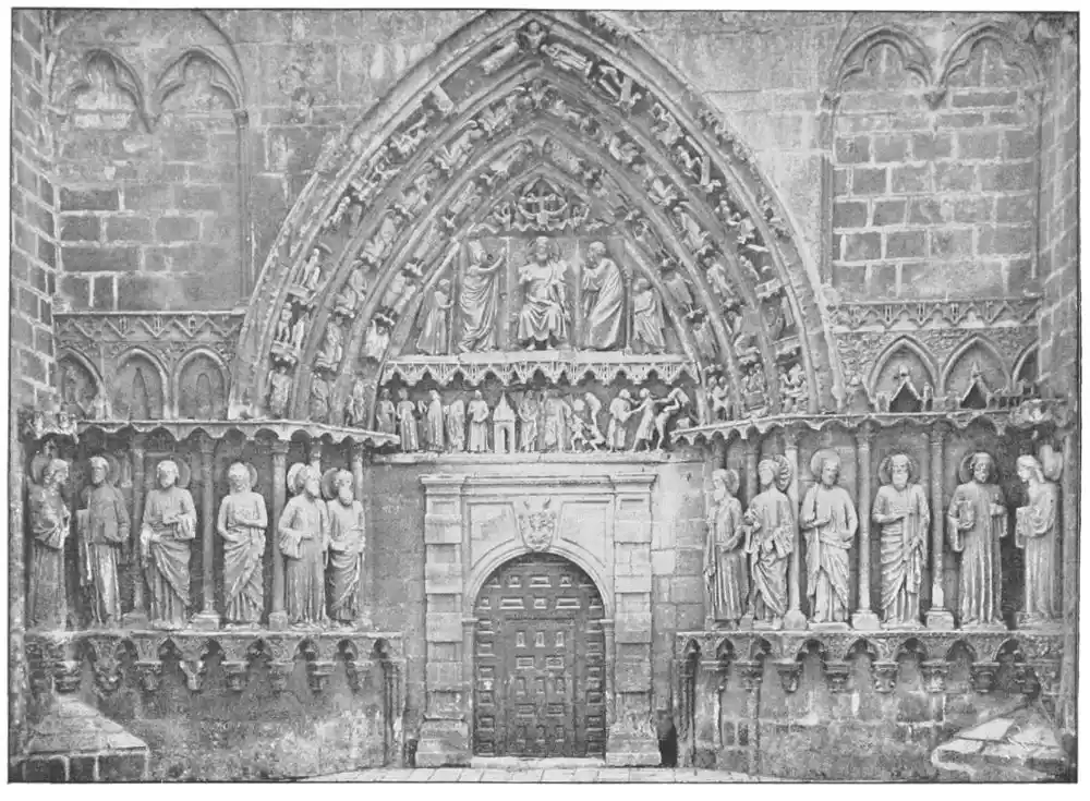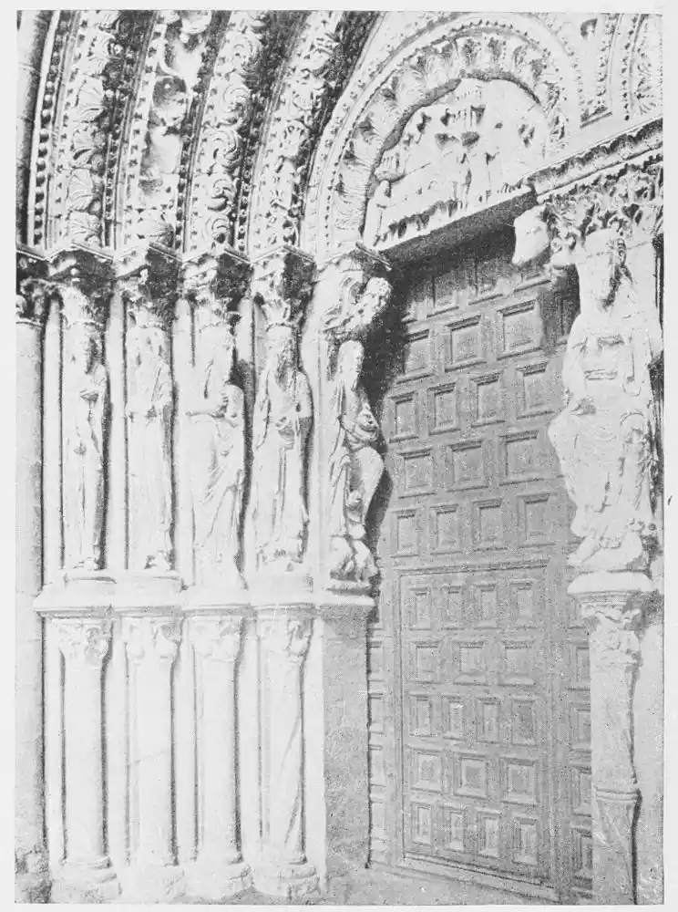 All the statues of this time were coloured, for Spain, always tenacious in her habits, never wavered from the custom of colouring her carvings to resemble life. However, few pieces retain manifest traces of such colourisation, the tints having been lost through the action of the atmos{38}phere, as well as through frequent washings. The statues in the Gloria of Santiago de Compostella (Plate 30) are among the earliest works that are clearly painted, and even in these, as we have seen, it is very doubtful if the present tints represent the original colours used.