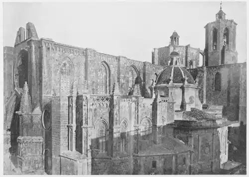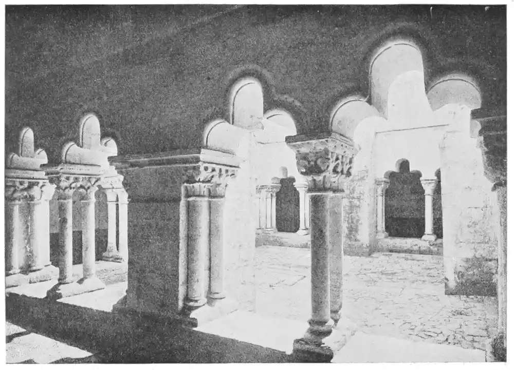 Two Romanesque churches, one belonging to the same period, the other to a later date, with a more advanced art, are the church and fine cloisters of San Pablo del Campo of Barcelona (Plate 16) and the Cathedral of Sigüenza. This last church, which was begun in 1102 and consecrated in 1123, was not completed until the thirteenth century. It is the most important example of the late-Romanesque Transition style. San Pablo was originally a Benedict convent, erected in 914 by Count Guitardo, but the building was restored in 1117 by Guiberto Guitardo, and is an excellent specimen of early Catalan architecture. Like San Pedro of Huesca, it has three parallel apses. The nave and transept are covered with barrel vaulting, and{33} above the crossing rises an octagonal cupola. On the chief portal are carved figures of St. John and St. Matthew; and especially interesting are the carved capitals of the columns, both those in the church itself and even more those in the cloisters, where we find cusped arches in the Saracenic style, coupled shafts, and richly decorated capitals.