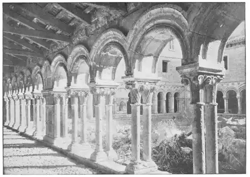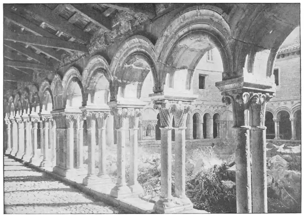 The Romanesque period lasted longer in Spain than in France; we do not find the Pointed or Gothic style before the twelfth century, when the Cistercian order introduced the severe and noble Burgundian type of church. But many old churches, though begun in the Romanesque period, assumed a Gothic character before their completion; we find this at Tarragona, in the old Cathedral of Salamanca, and in those of Londa and Tudela, as well as in many other churches. In the Monastery of Las Huelgas, Burgos, celebrated as the church where Edward I. of England was knighted by{34} Alonso the Learned, the church, dating from 1279, is in severe Gothic style; the cloisters, too, are Gothic, but in the earlier Claustreo (Plate 17) there are fine Romanesque capitals and arches. Again, the older and less-known Cistercian Abbey at Verula is a Transition building, while the beautiful cloisters of the fourteenth century are Gothic.