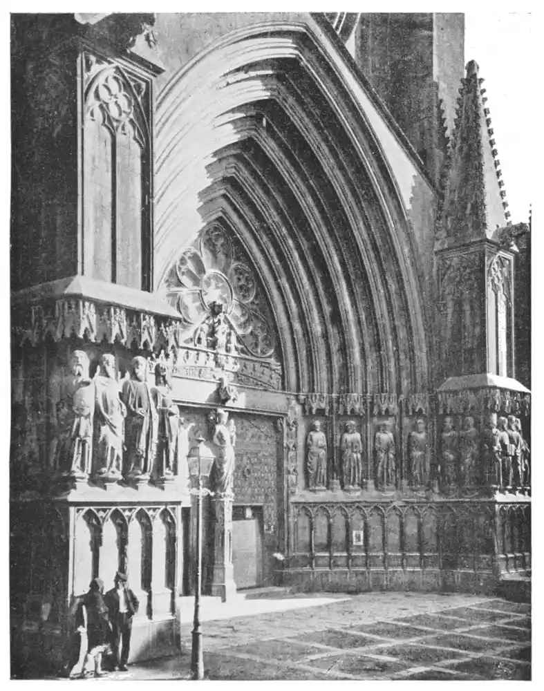 The Cathedral of Tarragona represents the same diversity in its statuary as we have noted in its architectural styles. Thus the statuary of the west façade may be divided into three distinct groups. The first, date about 1278, consists of the beautiful sculptured figures of nine Apostles, placed on the main portal, which were carved by the Catalan artist Maestro Bartolomé (Plate 36). The Apostles and Prophets on the buttresses were{43} executed a century later by Jaime Castayls, another native Catalan carver. They are clumsy and of ordinary character compared with the delicate work of Maestro Bartolomé. The group of the Virgin and Child which is placed above the pillars of the great door is not native work, but comes certainly from France. The author is unknown.
