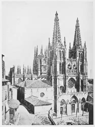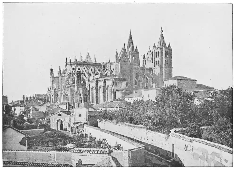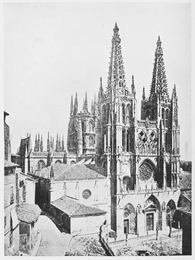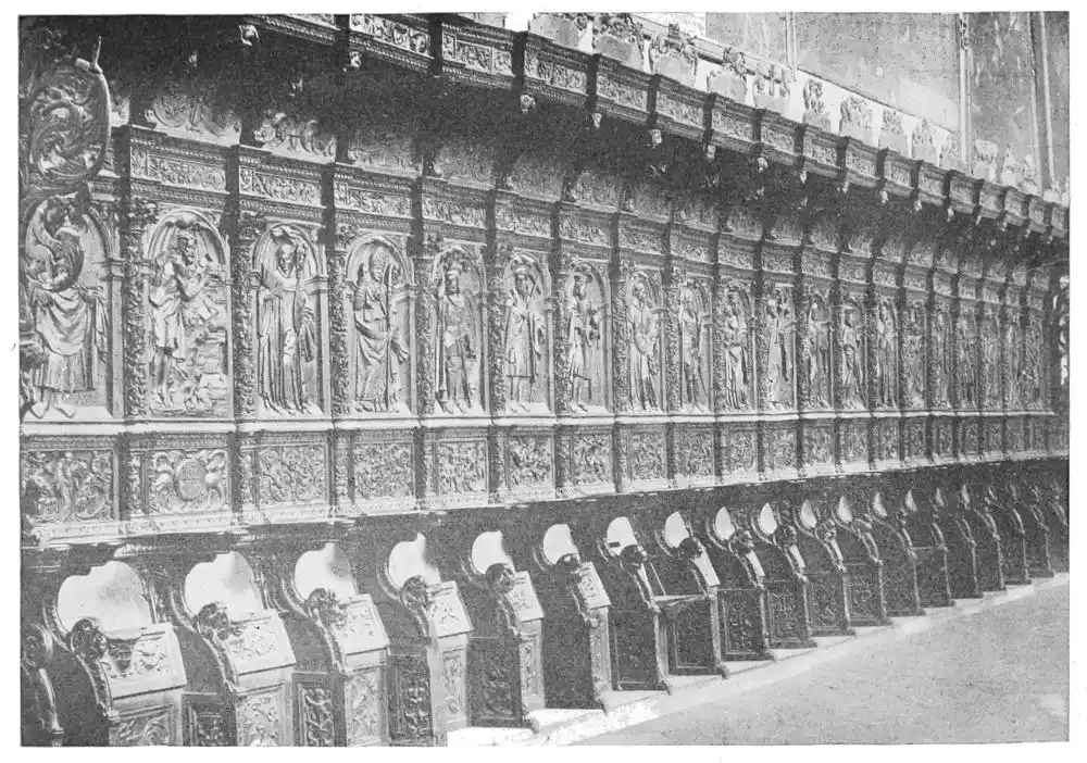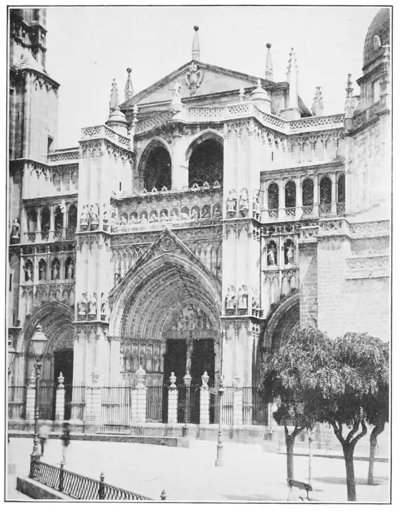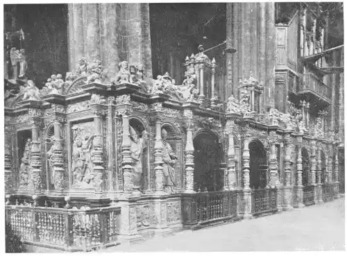 Following these early Gothic buildings we have the developed French cathedral style of the thirteenth century introduced into Spain. It is first seen in the great cathedrals of Burgos and Toledo (Plates 20 and 21), and a little later in that of Leon (Plate 22), the most perfect of the Gothic cathedrals in Spain. Very little of the national Spanish art is visible in these buildings; built for the most part by French architects, they recall in turn the cathedrals of Rheims, Beauvais, Bayonne, and Amiens; some see in Leon a copy of the great cathedral at{36} Chartres. The truth is that the style of these buildings is eclectic; they are all distinguished by the romantic magnificence of their ornamentation. The elaborately carved choir-stalls of Leon Cathedral (Plates 23-29) furnish a splendid example of the power of carving. They are the masterpiece of John of Malines and the Dutch artist Copin. It was from carvings such as these that the native artists drew their inspiration.{37}