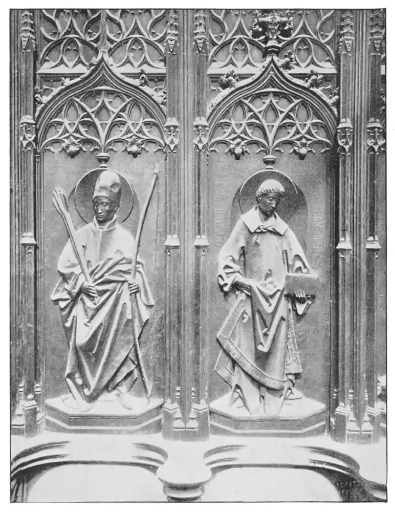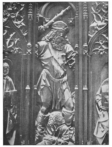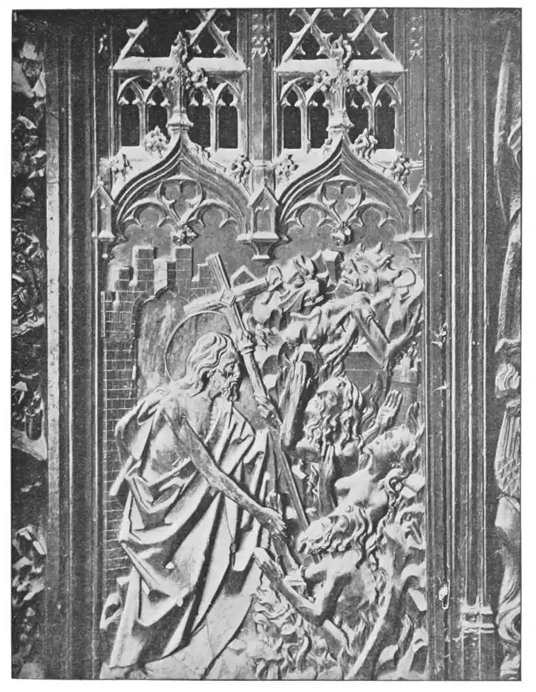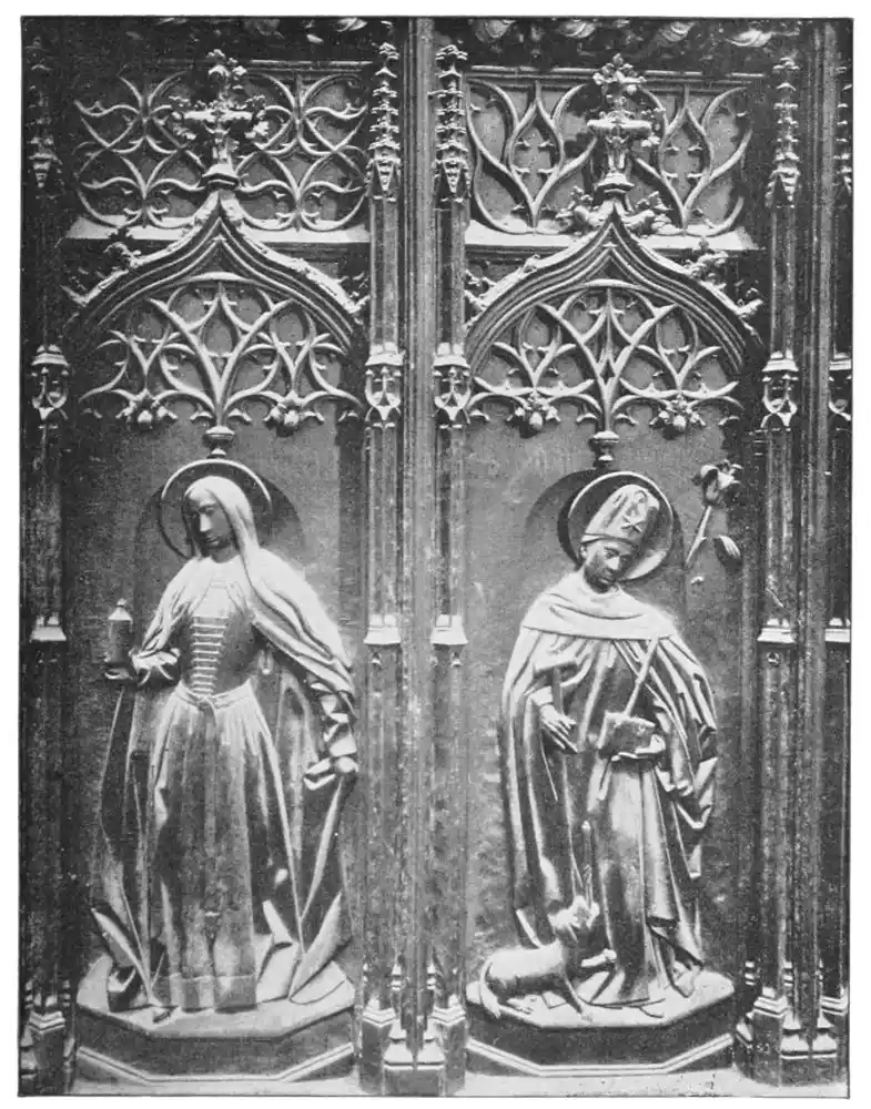 In the Tarragona screen charming pinnacles crown a bas-relief representing the Virgin and her Child, to the right and left of which stand St. Paul and St. Tecla, figures of heroic size, who regard the group with pious emotion. Beside them are bas-reliefs, most minutely executed, representing scenes in the saint’s life. In one we see her as described by Voragine, with serene face, her body nude, and praying in the midst of the flames which envelop without burning her. Angels encourage and sustain her, while below are seen the grinning heads of the damned. In another scene the saint is surrounded by reptiles and wild beasts in the cave into which she was thrown; and in yet another she stands beside a bull, destined to drag and crush her body among the stones of the road. Between the bas-reliefs are statues of prophets, apostles, and saints; and on brackets, in the midst of foliage, repose female saints with{55} smiling faces. All the figures are carved with great skill, and besides there is a wealth of detail—flowers, foliage, animals, and insects—all of which are treated with surprising ability.