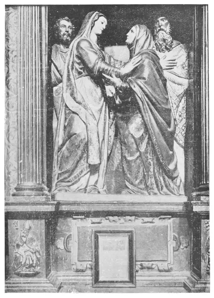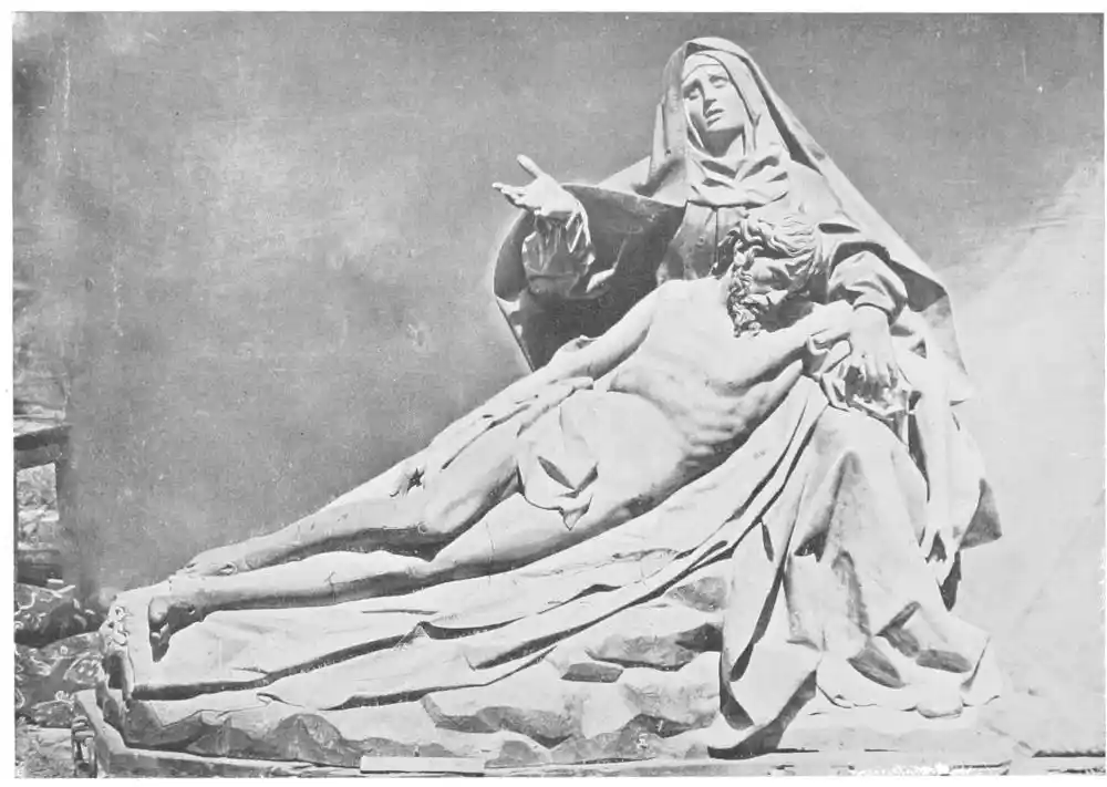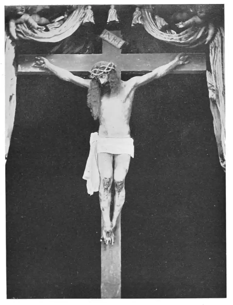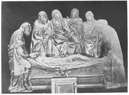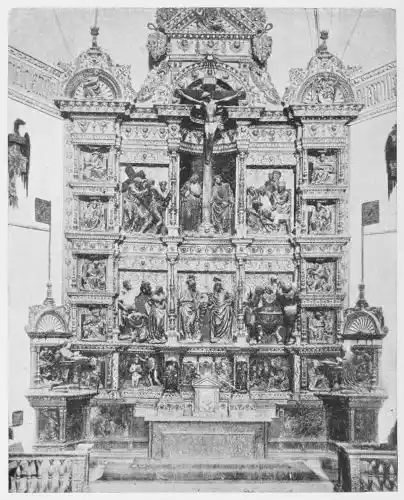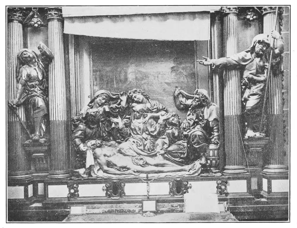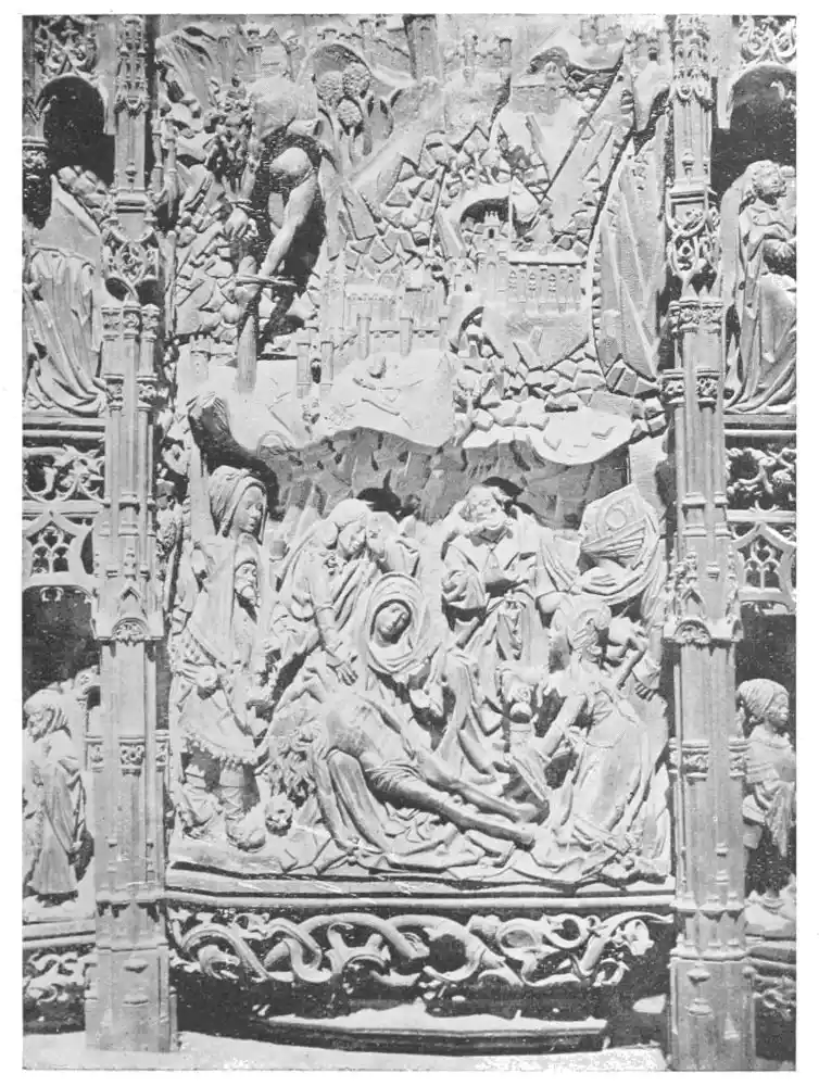 The cathedral altar-screen is a bas-relief representing the Descent from the Cross. The Virgin supports the body of the Christ, and around them are grouped St. John and several disciples, the Magdalen, and the holy women. The figures are larger than life-size. In the background are the two thieves outlined against the Temple, which is seen in the distance. Around this central composition are beautiful angel figures carrying the instruments of the Passion. Then on the base of the altar is outlined the triumphal entry of Jesus into Jerusalem.