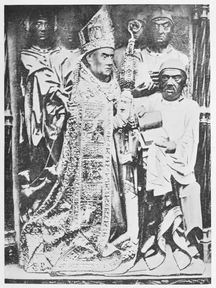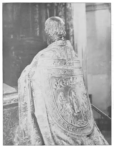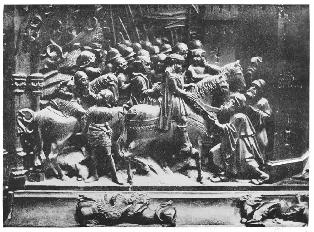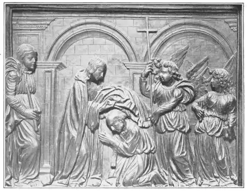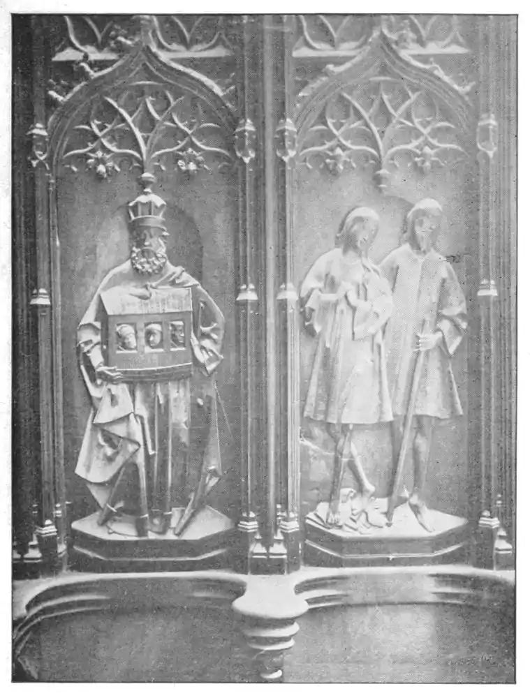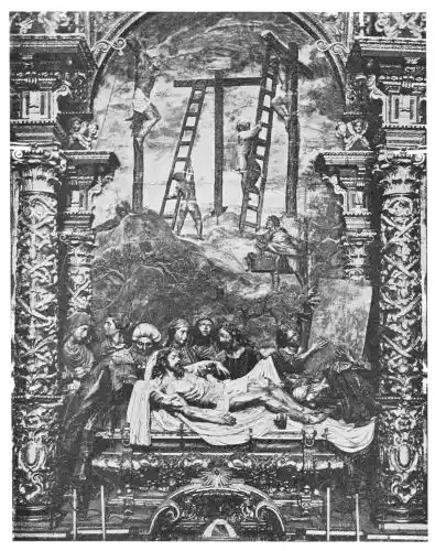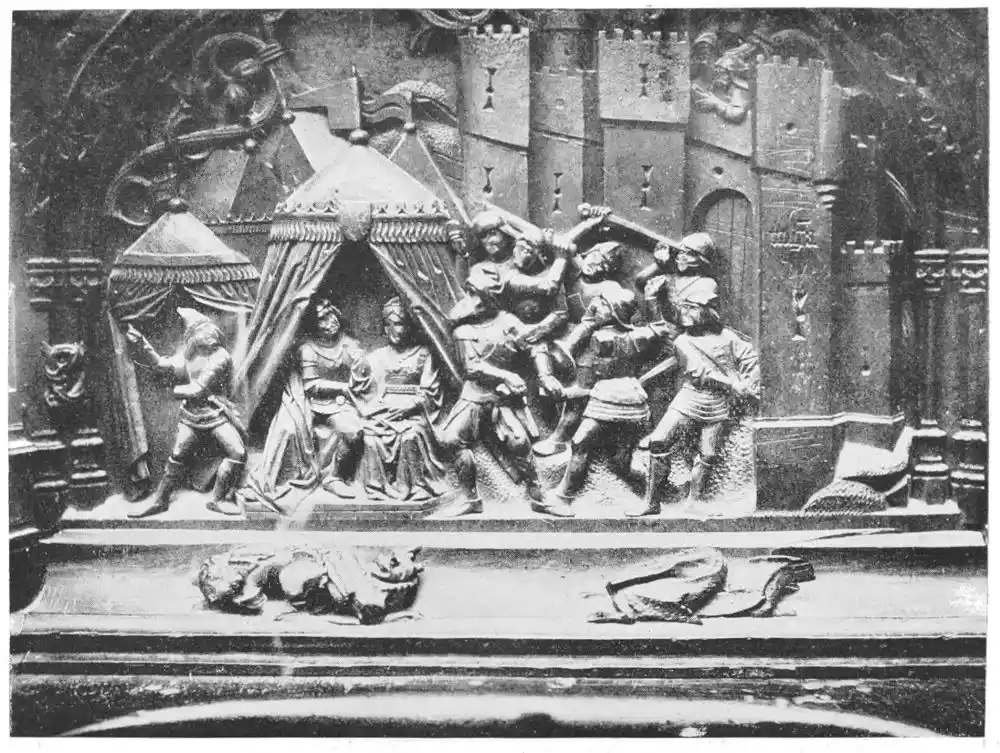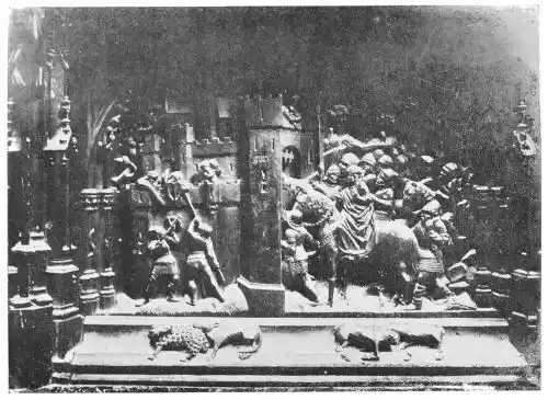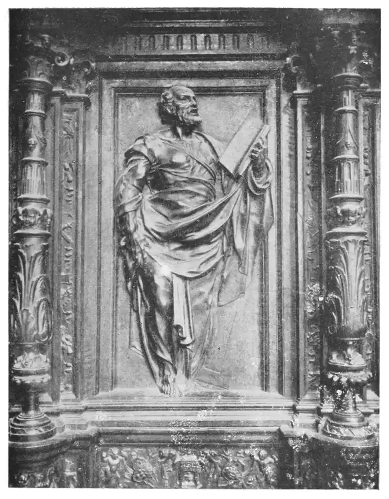 The cathedral altar-screen is a bas-relief representing the Descent from the Cross. The Virgin supports the body of the Christ, and around them are grouped St. John and several disciples, the Magdalen, and the holy women. The figures are larger than life-size. In the background are the two thieves outlined against the Temple, which is seen in the distance. Around this central composition are beautiful angel figures carrying the instruments of the Passion. Then on the base of the altar is outlined the triumphal entry of Jesus into Jerusalem.