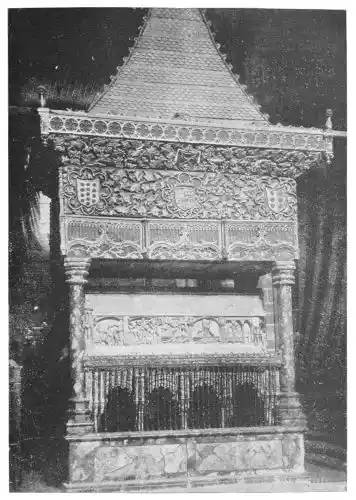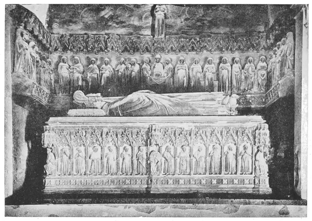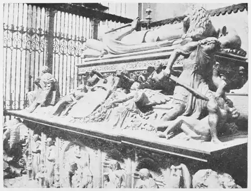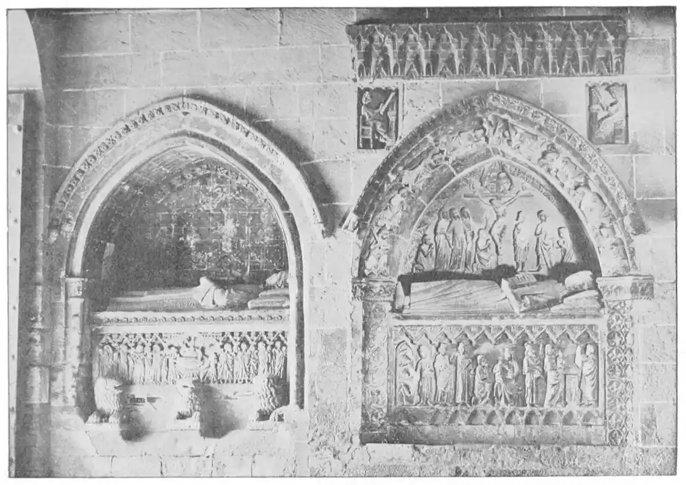Statues on tombs are very numerous, and we find them in almost every church. At first the figures are rudely carved, the skill of the artist being expended on the frames, and the cast of the features being largely a convention. Indeed these early monumental figures cannot be regarded as portraits. Among the first examples are the{41} figures on the royal monument at Najera, erected by Sancho III. 1157. Here the figures are mere puppets. Another early tomb is that in the Convent of Las Huelgas, Burgos (Plate 34). Even the sarcophagus of St. Eulalia, at Barcelona, of as late a date as 1327, with its Pisan reminiscences, shows how easily art was sometimes satisfied at this period.
