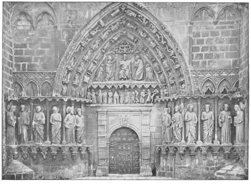It is necessary to remember that the geographical barrier of the Pyrenees forms no real ethnological separation between that country and Spain; one and the same Iberian race dwells in Gascony, Navarre, and the Basque provinces. Hence it is easy to understand that natural relations, intimate and frequent, grew up between the two countries. Marriage alliances united the two royal families, and the princes of France crossed the frontier to fight against the Moors in Spain. With them came priests and monks, more learned than their neighbours, many of whom settled in the Peninsula. In this way the influence of the great orders of Cluny and Citeaux spread and grew powerful.{26} Then followed architects and sculptors from Aquitaine, Languedoc, Toulouse, Burgundy, and Normandy, to find work, and impress their separate influences on the numerous churches that at this time were being built. The Romanesque cathedrals are indeed the direct outcome of French mediævalism; and the figure-statues of the numerous tombs and altars are full of reminiscences, so that it is difficult to distinguish the native art. Yet in the midst of these imported styles we shall find, do we seek them, those distinct traits which belong to Spain.