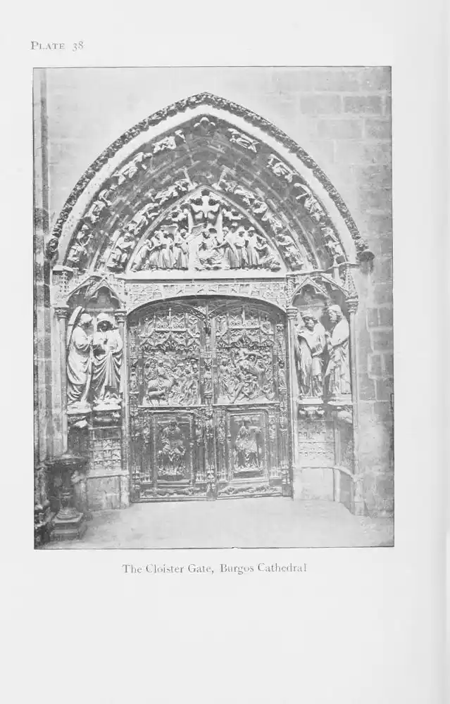 The cloisters and portals of the Cathedral of Burgos offer another example of an admirable museum of sculpture. The earlier carvings—such, for instance, as the figures on the Apostles’ door (Plate 37), belonging to the opening years of the thirteenth century—are somewhat stiff and constrained in style and contrast with the graceful ease of the later works of the fourteenth and fifteenth centuries (Plate 38). The special interest of the cloisters is that its carvings are coloured, and fortunately up to the present they have not suffered from restoration (Plates 39-41). The colours are faded, but we can see that the vivid reds and blues, so much loved by the Moorish artists employed by the Christians of this period, were used, as well as a preponderance of gilding. Here, as at Salamanca, the general tone of the colourisation is in the mudèjar style.