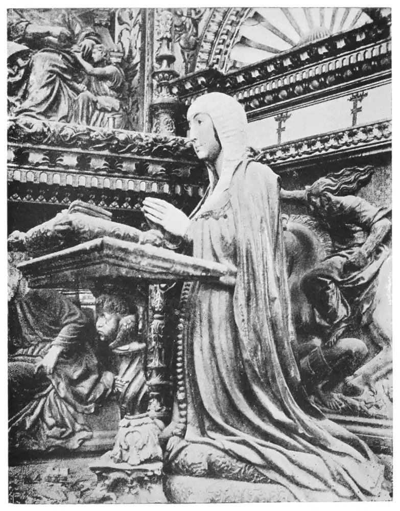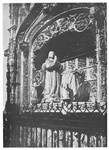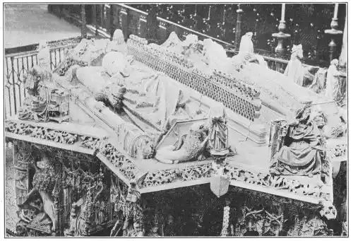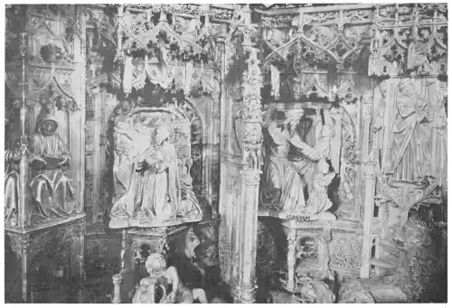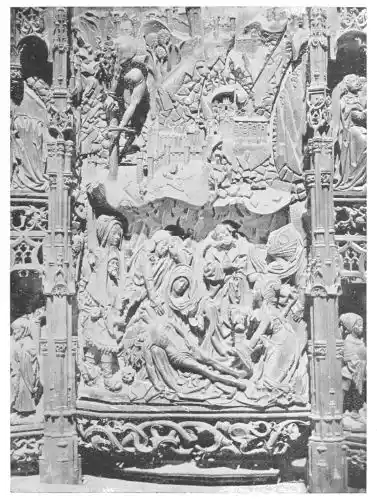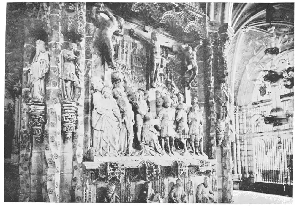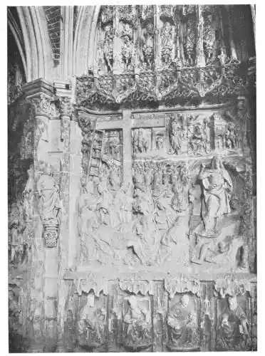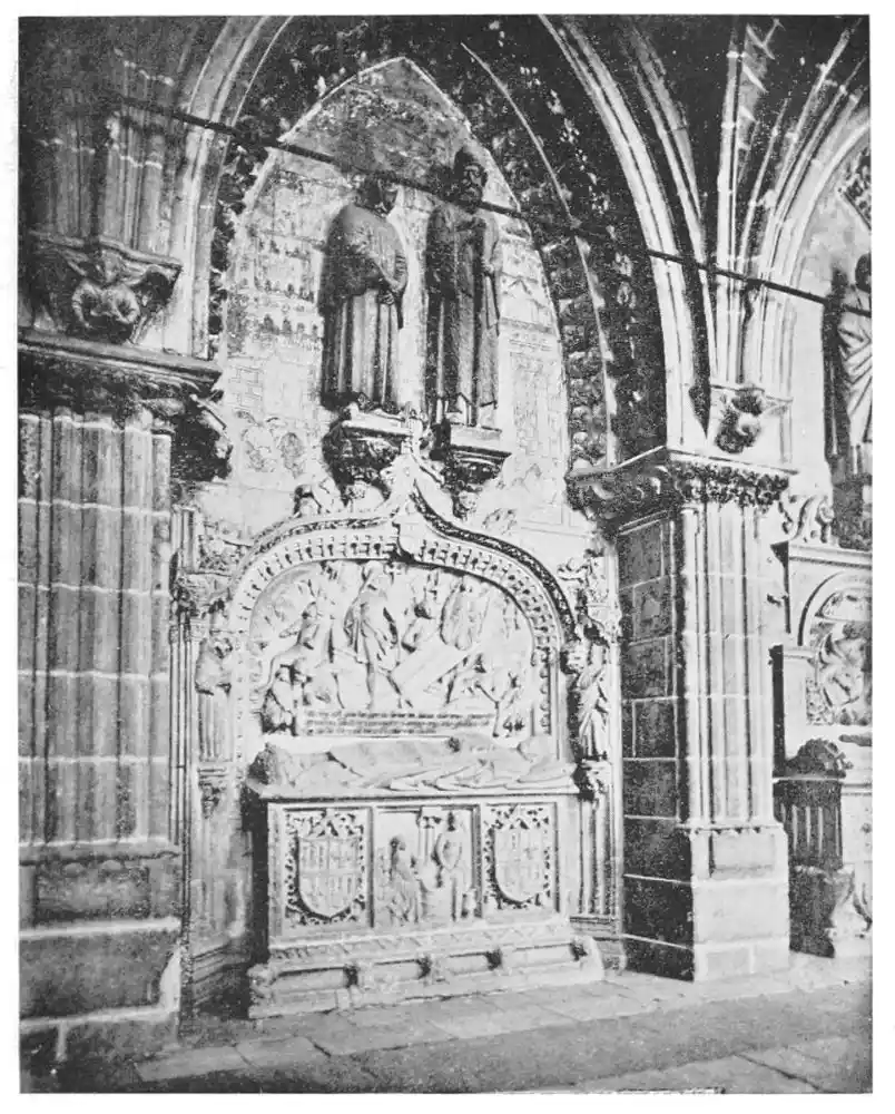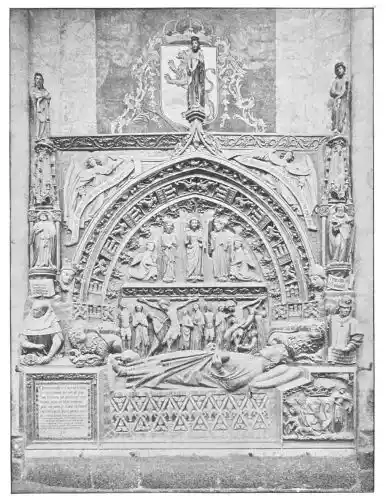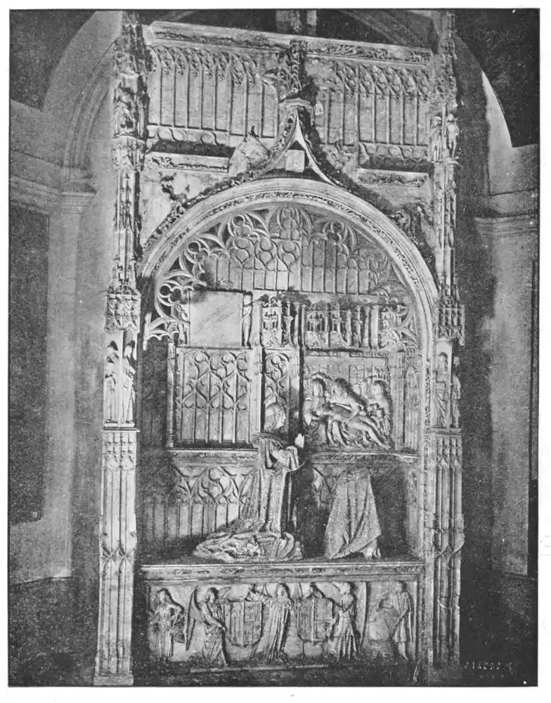 The Cathedral of Burgos is rich in Gothic tombs. The statues of St. Ferdinand and Beatrice of Swabia, on the north wall of the cloisters, are among the finest specimens of portrait sculpture. In the same place is the late Gothic tomb of Don Gonzalo de Burgos. The monument of Archbishop Maurice (died 1238), which is in the centre of the choir, is also a work of special importance, showing, as it does, the skill of the Spanish artists in enamelled copper (Plate 43). Of the same style is the tomb of Jaime of Aragon (Plate 46), who died in 1334, in Tarragona Cathedral, and two monuments in the Cathedral of Leon, that of Martin, the first bishop of the city (Plate 47), the other of Don Ordoño II., who died 923 (Plate 48). All three monuments are of excellent workmanship, and important as fine specimens of portrait sculpture. We may mention also the sarcophagus of St. Vincent and his sisters, SS. Sabina and Criseta, in the Church of San Vicente at Avila (Plate 49), with notable reliefs of the thir{45}teenth century, and surmounted by a Gothic canopy of a later date—about 1465—resting upon coupled columns. But indeed it is difficult to make a selection among the numerous monuments that claim attention. One work stands out as a masterpiece. The magnificent tomb of Archbishop Lopez de Luna, in the Seo of Zaragoza, is the most splendid example of the French-Gothic style in Spain (Plate 50). Even so calm a critic as Professor Carl Justi pronounces this work “a masterpiece.” Mitre on his head, a cross in his hand, and dressed in rich pontifical robes, the figure reclines on the sarcophagus. The face, set in the calm of death, is modelled by a master hand. Behind, placed in a niche which is cut in the thickness of the wall, stand a company of monks and nuns, who weep for their benefactor. Other figures are grouped along the inner face of the tomb; each is marked with character, and is carved with fine skill. But it is not possible to convey in words the effect of this splendid and simple work. In its style it may be compared with the mausoleum of Philippe the Bold, the masterpiece of Burgundian art. It is of the same date, and M. Marcel Dieulafoy believes that the Spanish monument must have been executed in Spain by Aragonese artists who had learnt the{46} art of carving in France. This opinion of French influence directing the native artists is supported by the fact that the Tarragona monument is not a solitary example. This French style of carving spread over the Peninsula; the cathedrals of Burgos, Leon, and Toledo—to name a few out of many churches—are rich in similar monuments. It is necessary to remember this close connection between the arts of France and Spain. The great ecclesiastical orders of France, and especially that of Cluny, gave inspiration to the Romanesque and Gothic periods. It was not until the last third of the fifteenth century, when a new art method came from the Netherlands, that the French influence weakened. Spanish art was almost invariably stimulated from without. But it was these imported art-styles, naturally awakening imitation, which called into existence the native schools of carving, and showed anew those distinct traits which can be called Spanish.