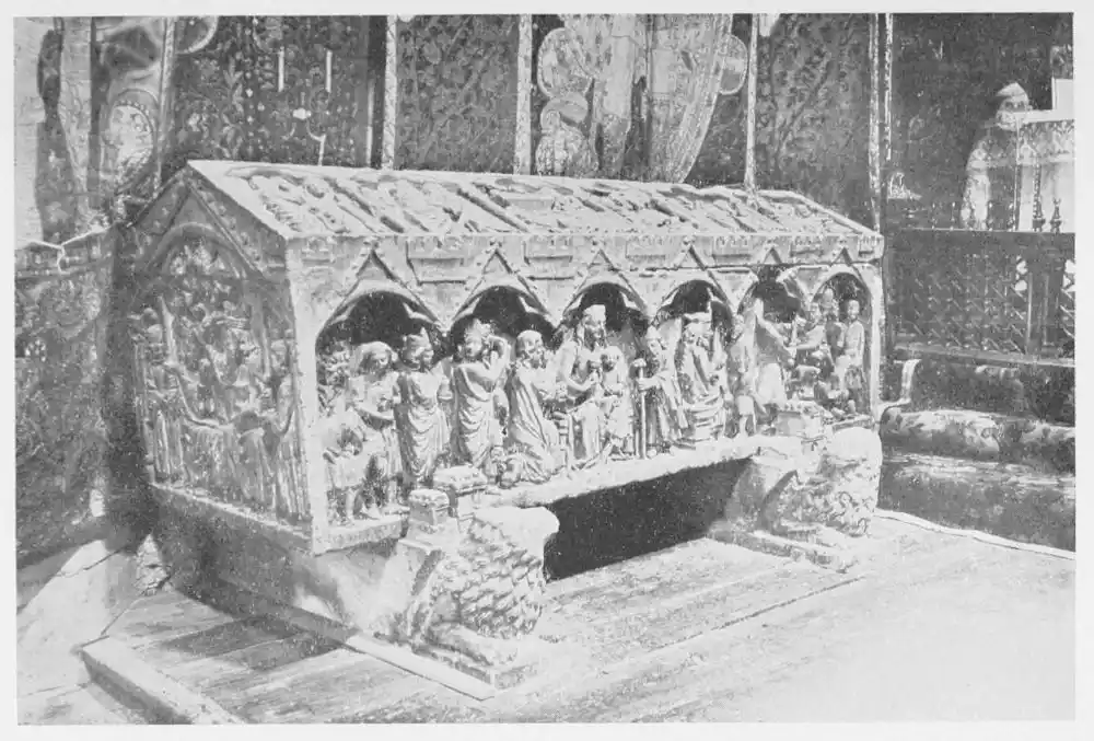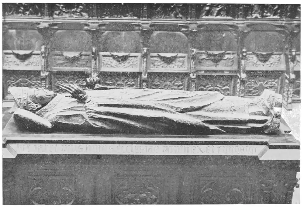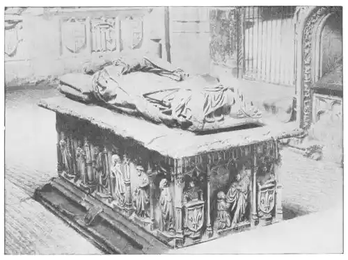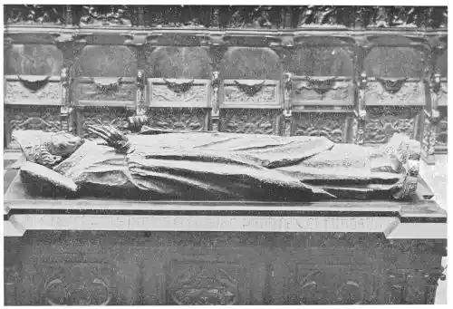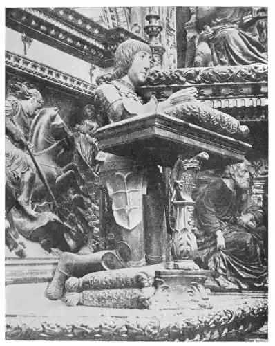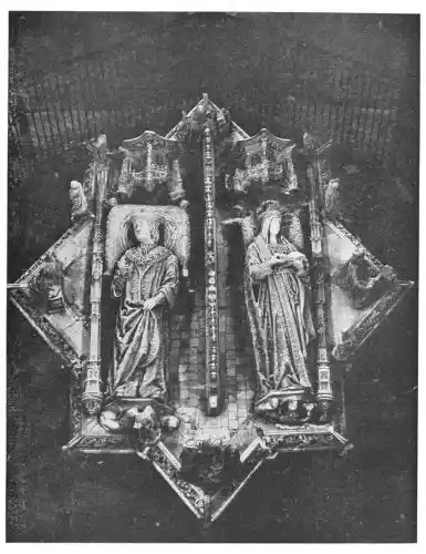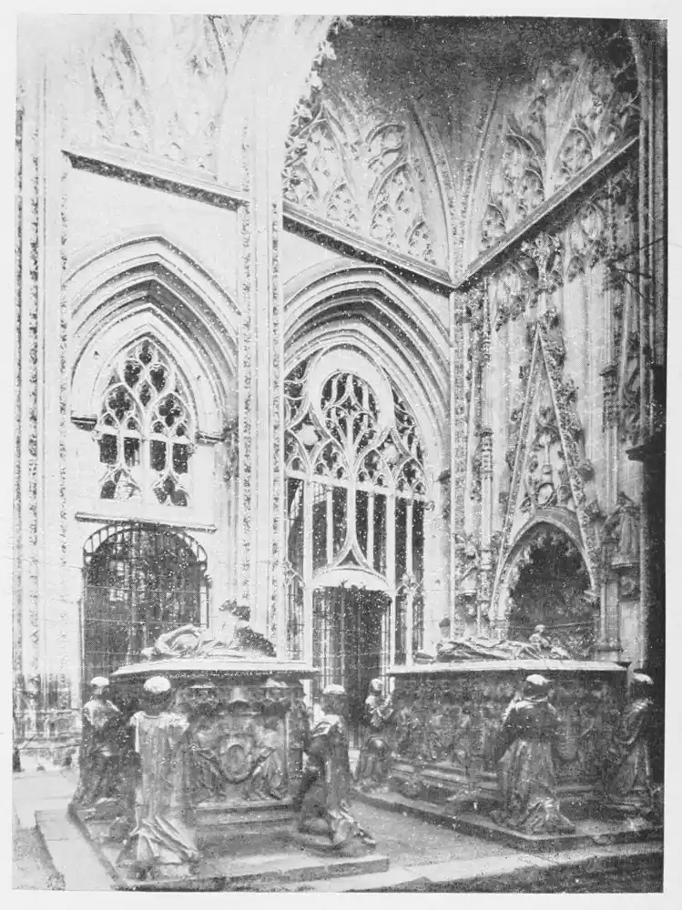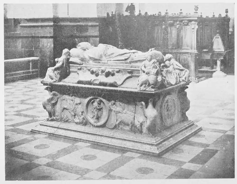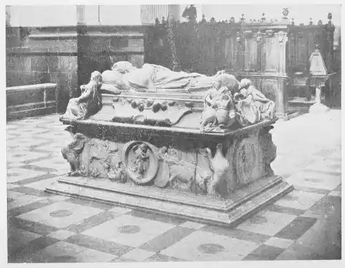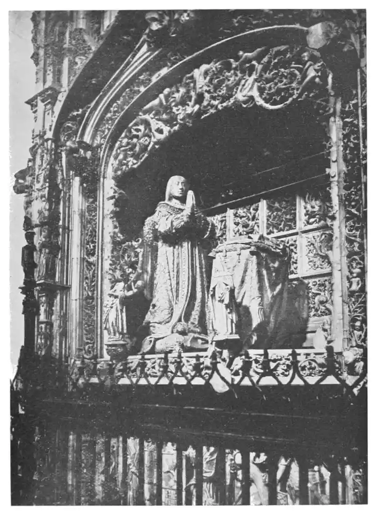 The Cathedral of Burgos is rich in Gothic tombs. The statues of St. Ferdinand and Beatrice of Swabia, on the north wall of the cloisters, are among the finest specimens of portrait sculpture. In the same place is the late Gothic tomb of Don Gonzalo de Burgos. The monument of Archbishop Maurice (died 1238), which is in the centre of the choir, is also a work of special importance, showing, as it does, the skill of the Spanish artists in enamelled copper (Plate 43). Of the same style is the tomb of Jaime of Aragon (Plate 46), who died in 1334, in Tarragona Cathedral, and two monuments in the Cathedral of Leon, that of Martin, the first bishop of the city (Plate 47), the other of Don Ordoño II., who died 923 (Plate 48). All three monuments are of excellent workmanship, and important as fine specimens of portrait sculpture. We may mention also the sarcophagus of St. Vincent and his sisters, SS. Sabina and Criseta, in the Church of San Vicente at Avila (Plate 49), with notable reliefs of the thir{45}teenth century, and surmounted by a Gothic canopy of a later date—about 1465—resting upon coupled columns. But indeed it is difficult to make a selection among the numerous monuments that claim attention. One work stands out as a masterpiece. The magnificent tomb of Archbishop Lopez de Luna, in the Seo of Zaragoza, is the most splendid example of the French-Gothic style in Spain (Plate 50). Even so calm a critic as Professor Carl Justi pronounces this work “a masterpiece.” Mitre on his head, a cross in his hand, and dressed in rich pontifical robes, the figure reclines on the sarcophagus. The face, set in the calm of death, is modelled by a master hand. Behind, placed in a niche which is cut in the thickness of the wall, stand a company of monks and nuns, who weep for their benefactor. Other figures are grouped along the inner face of the tomb; each is marked with character, and is carved with fine skill. But it is not possible to convey in words the effect of this splendid and simple work. In its style it may be compared with the mausoleum of Philippe the Bold, the masterpiece of Burgundian art. It is of the same date, and M. Marcel Dieulafoy believes that the Spanish monument must have been executed in Spain by Aragonese artists who had learnt the{46} art of carving in France. This opinion of French influence directing the native artists is supported by the fact that the Tarragona monument is not a solitary example. This French style of carving spread over the Peninsula; the cathedrals of Burgos, Leon, and Toledo—to name a few out of many churches—are rich in similar monuments. It is necessary to remember this close connection between the arts of France and Spain. The great ecclesiastical orders of France, and especially that of Cluny, gave inspiration to the Romanesque and Gothic periods. It was not until the last third of the fifteenth century, when a new art method came from the Netherlands, that the French influence weakened. Spanish art was almost invariably stimulated from without. But it was these imported art-styles, naturally awakening imitation, which called into existence the native schools of carving, and showed anew those distinct traits which can be called Spanish.