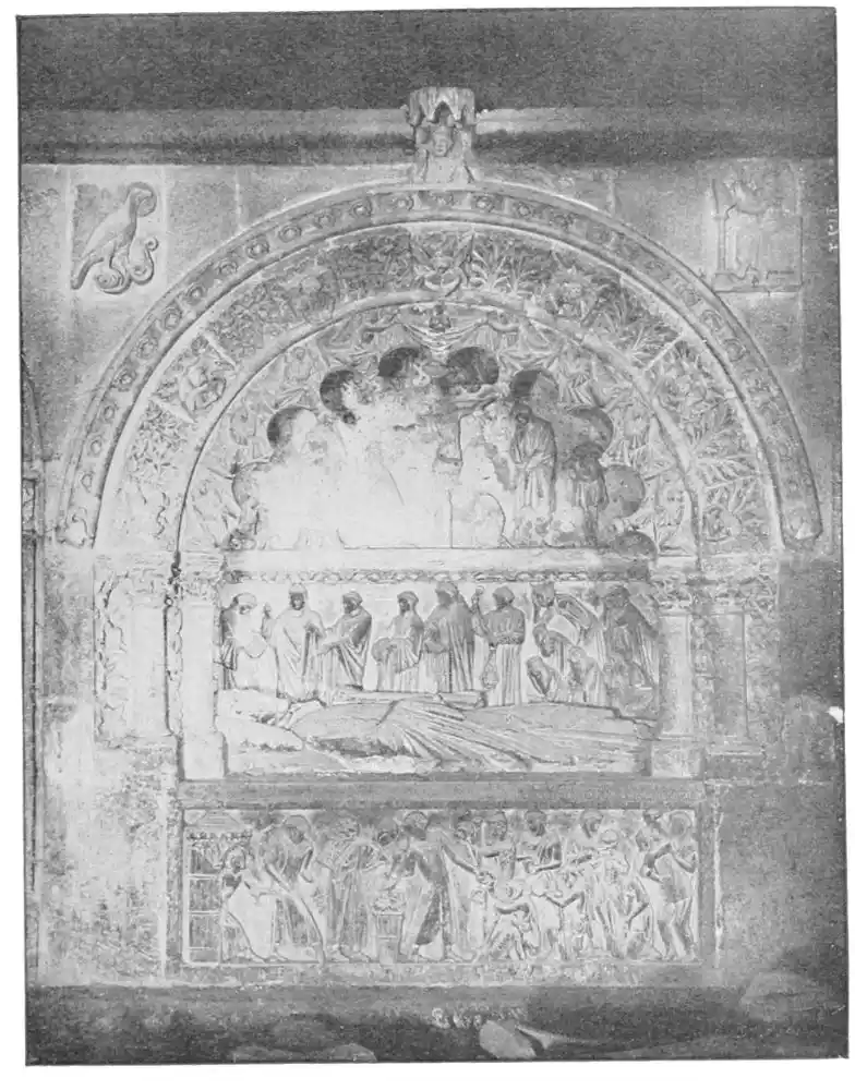 But there are some really fine tombs belonging to the Romanesque period. The Church of the Magdalena—formerly of the Templars—at Zamora contains two knights’ tombs, one of which M. Marcel Dieulafoy considers the finest Romanesque tomb in Spain. The figure, just expired and resting on the death-bed, is placed beneath a portico of twin balustrades which crown the structure. Fantastic animals are carved on the spandrils, and the columns and capitals are richly decorated. The couch stands against a wall, on which are sculptured seraphs, while two angels bear away to Paradise the materialised soul of the dead man wrapped in a winding-sheet. This device is common in Spain, where there are many tombs of the same character, but, writes M. Marcel Dieulafoy, “I do not know of one where the decorative sculpture is rendered more boldly or with greater talent.{42}”
