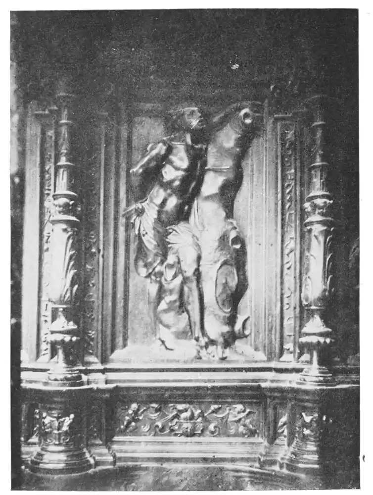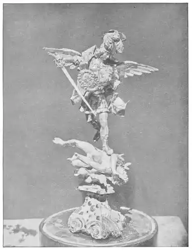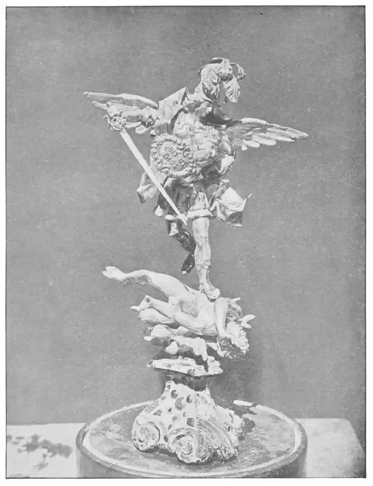 Very different in character, but of equal merit, is the small statue, silver painted, of St. George in the Audiencia Chapel at Barcelona. M. Marcel Dieulafoy believes that we owe this fine work to a{49} native artist. The figure, standing fully armed, is carved with youthful energy; the face, seen under the gilt visor, has lost none of its freshness, and the original tints of colouring remain. The armour is of oxidised silver, while the hinges, nails, belt, dragon, and pedestal are of burnished gilt. Of this statue M. Marcel Dieulafoy writes: “Had Meissonier painted the figure he could not have done it otherwise.” Again we have a triumph of polychrome.