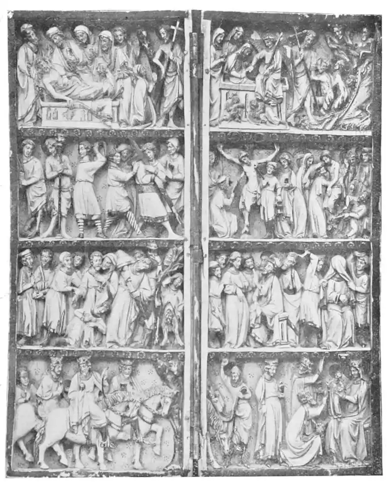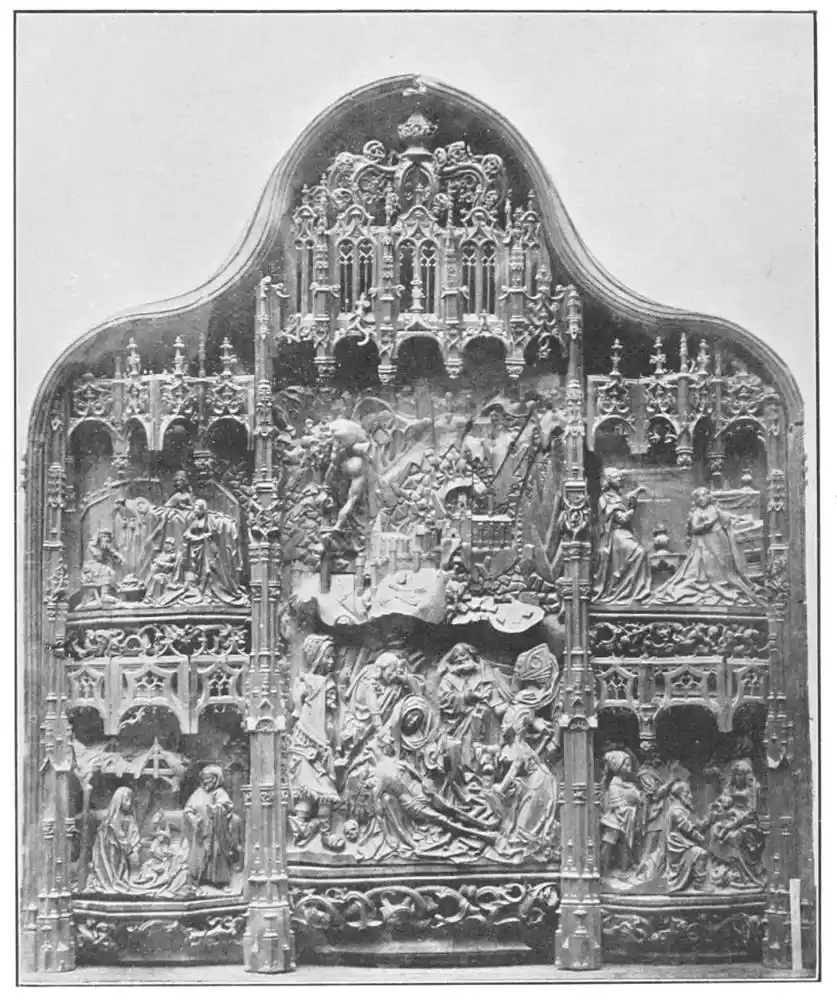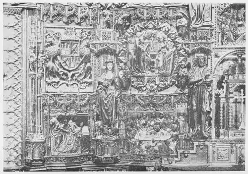 Their evolution is interesting and curious. At first we find them as screens of pagan and Roman origin, and dating back to the middle of the twelfth century. But the pagan screens were adapted by{51} Christians, who gave to them the name diptycha of the Apostles, of the Martyrs, and of the Saints, and used them as portable altars, and also largely as votive gifts, their richness being in proportion to the wealth of the giver and the importance of the subject depicted. We have several examples in the Camara Santa of Oviedo Cathedral and in the Camarin of Santa Teresa, Escorial (Plate 55). The Tablas Alfonsinas in the Sacristia Mayor of the Cathedral of Seville is another and more important example. This treasure is specially interesting, as it shows the actual use made of these folding tablets. It was the altar of Alfonso the Learned, and was presented by him to the cathedral in 1274 after he had used it in battle; for in Spain these altar-screens were carried by Christian generals travelling in the campaigns against the Moors. As the Reconquest progressed their importance increased, and we have triptycha and pentaptycha as well as diptycha; their number multiplied as they became richer and grander in ornament. They were connected with the deepest religious feelings of Christian Spain, being used by the Paladins to pray to before plunging into battle. Later, from portable altars they became fixed altars in churches. From this time their size and magnificence increased, the religious sentiment{52} associated with them explaining, as we believe, both their frequency and their importance in the art of the period.
