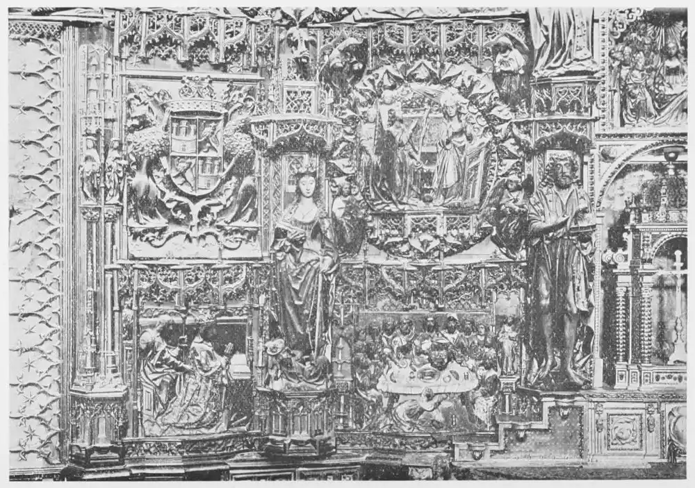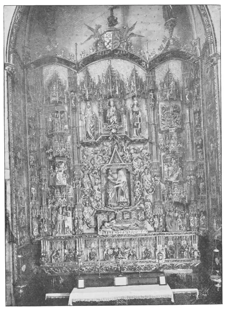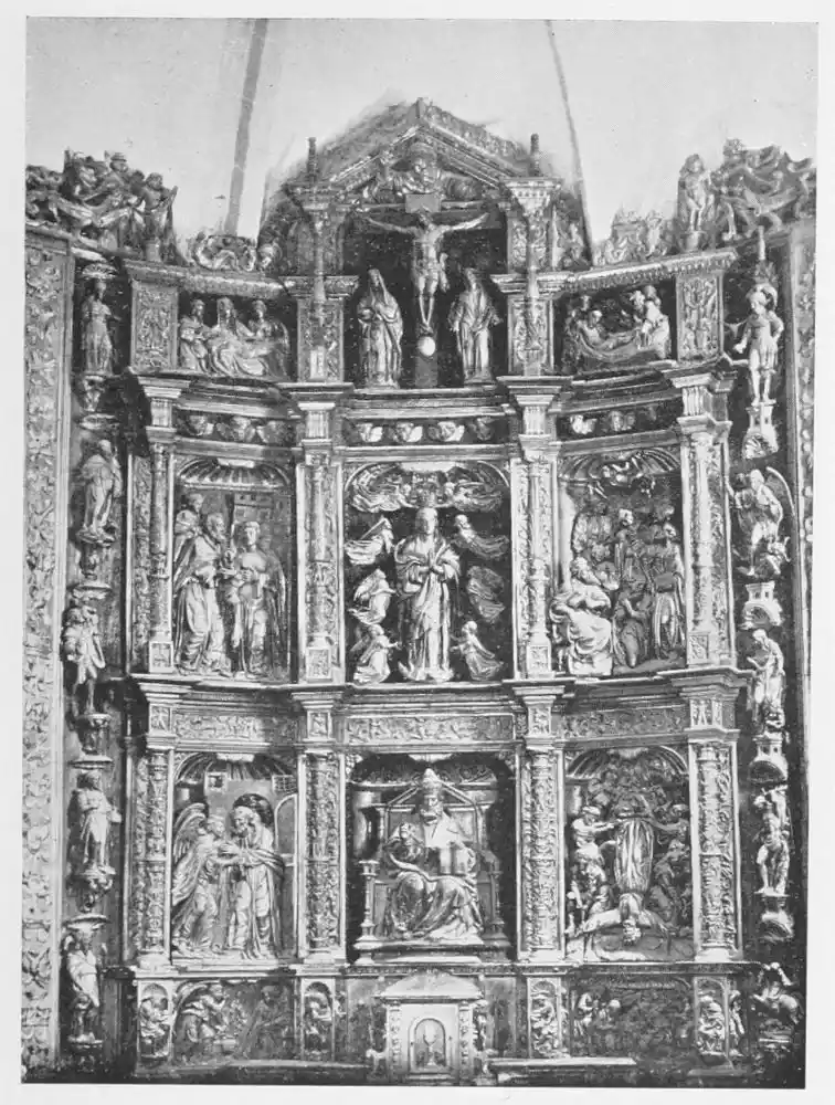 The altar-screens, of great size, and known in Spain as retablos, which meet us in every church may be considered as the most entirely characteristic expression of the country’s art. Nowhere has the development of the altar-screen assumed such importance. The huge retablos of Spain stand alone both in their dimensions and in their magnificence. In these works were joined the common efforts of the architect, the sculptor, and the painter. Of a size and with a wealth of decoration so great that often an examination of their detail is fatiguing, they represent the most exhaustive examples of the creative thought and power of representation of the native artists.