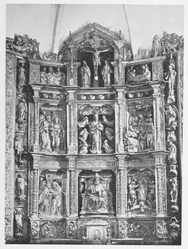 The creative power displayed in these retablos is often surprising. But it must be admitted that their general effect is less satisfactory than an{53} examination of the parts in detail would lead us to expect. The artists would often seem to have been hampered by the huge size they had to ornament. Continuing the accustomed forms, evolved for use in screens of more modest dimensions, they have gained the desired amplitude of ornament by a multiplication of the same forms that is often wearying. But granting this, it is among these works that many important and beautiful statues will be found. For this reason they cannot be overlooked by the student of Spanish polychromes.