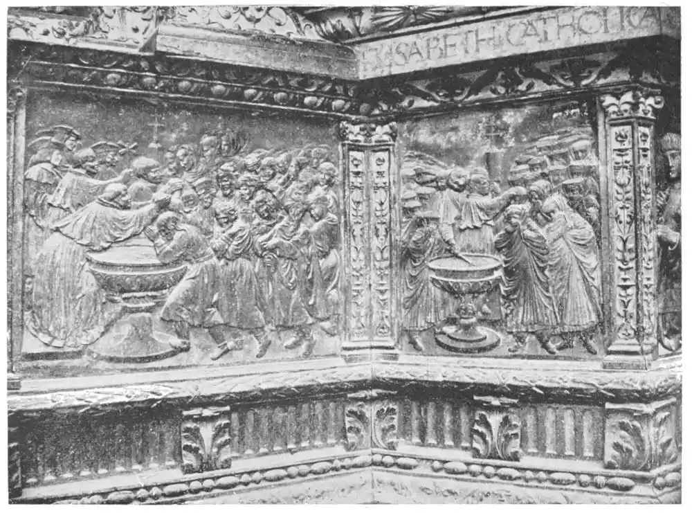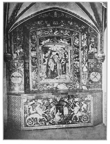 The oratory and screen of Isabella la Catolica in the Alcázar are interesting examples of the expression of this double influence (Plate 135). They are the work of Francisco Niculoso Pisano, an Italian artist who settled in Seville, and whose work was of importance in directing the art of the sixteenth century; the altar bears his inscription, “Francisco Niculoso me fecit,” with the date 1503. The principal parts of the altar and also the screen are in very pure Italian style, but the{123} panel above the altar, as well as some details of the decoration, show clearly the old Spanish traditions founded on the Flemish methods. This may be explained as M. Marcel Dieulafoy suggests, if we accept the theory that the Italian master employed his colleague Pedro Millan to assist him in the execution of the work.