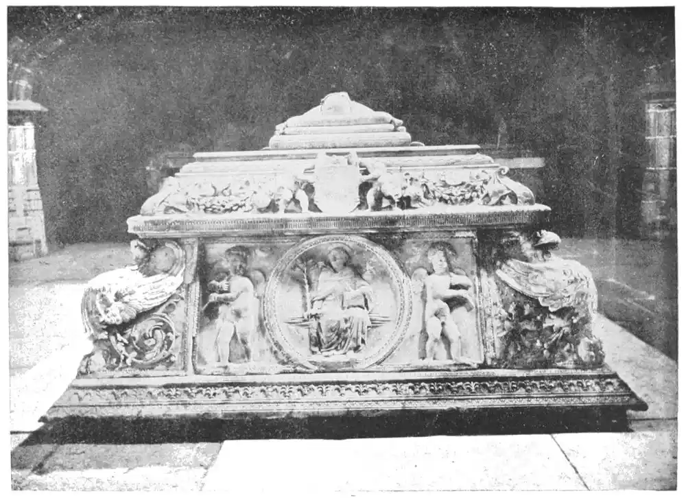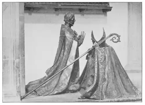 The statues, once funeral monuments, but now set into the wall of the old Cathedral of Salamanca, are important as being among the most complete examples of the twelfth-century polychrome (Plate 35). The sarcophagus, the reclining figures, and the niches containing them are all painted—red, blue-black, and white being the predominating tints. There are some traces of yellow, probably due, as M. Marcel Dieulafoy suggests, to the sizing used in fixing the gilding; there are also some green tints in the foliage which decorates the arch in one of the tombs. Fortunately these statues have suffered very little from the hand of the restorer. The statue of Diego de Anaya on the tomb in the Capilla de San Bartolomé, to the south of the cloisters, is another work of importance in the same cathedral. It is quite ideal in its treatment.